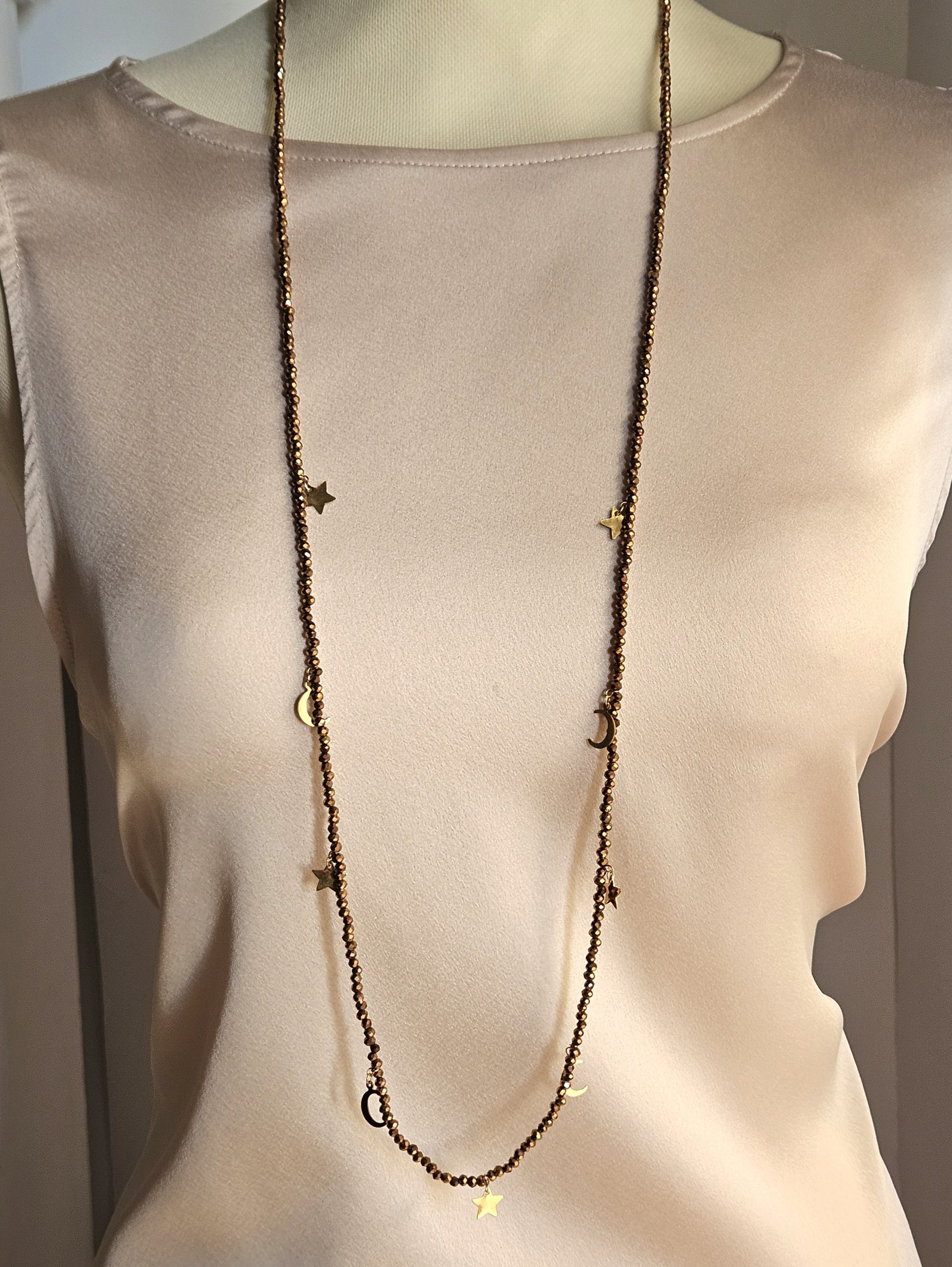 Collana in pietre tonde sfaccettate colorate con nove charms composti da stelline e lunette in ottone dorato.