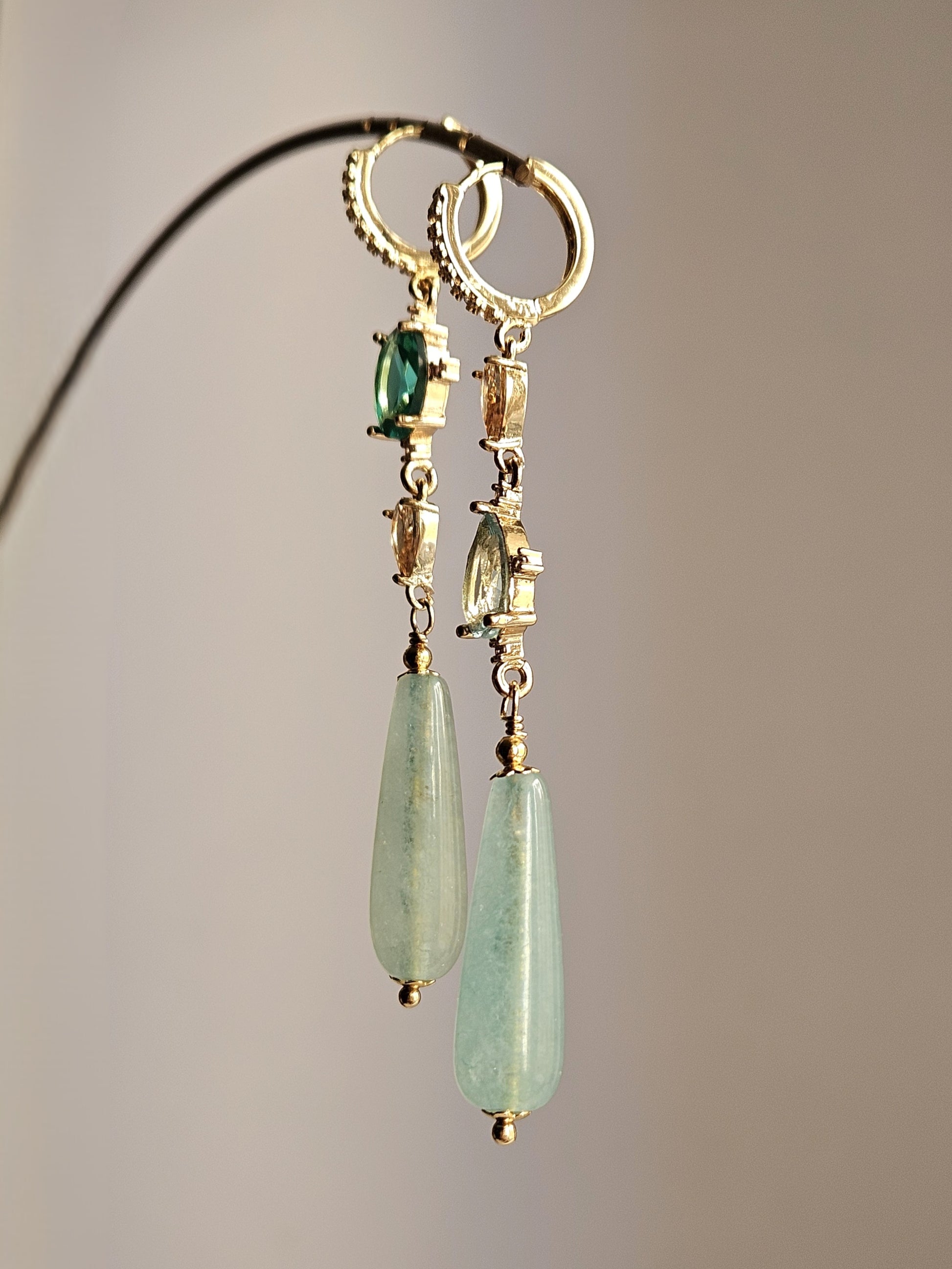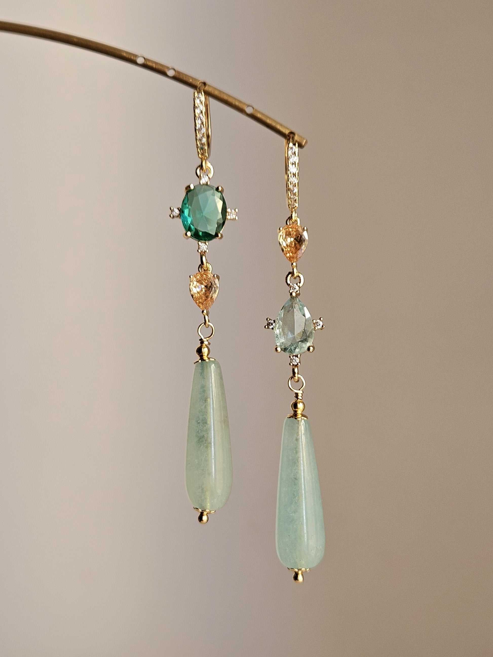 Componenti: strass a goccia piccola colore vaniglia; strass ovale colore smeraldo e strass a goccia grande colore acquamarina ; gocce in agata colore acquamarina.