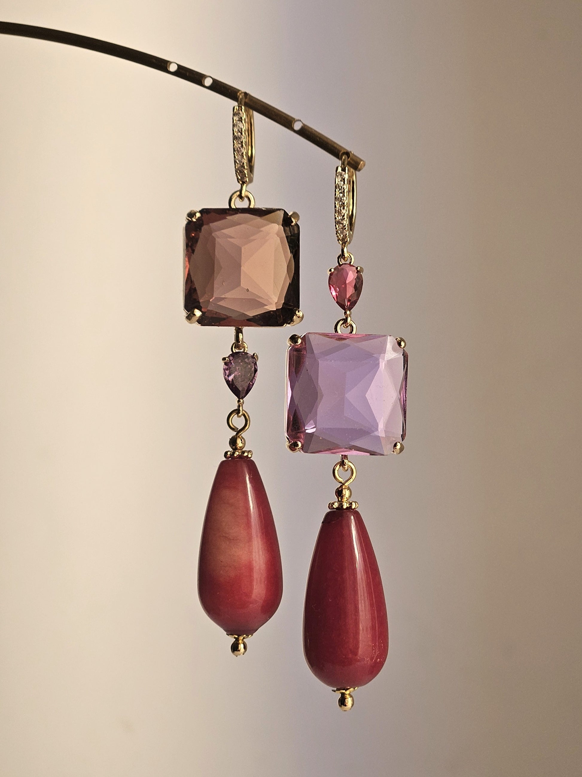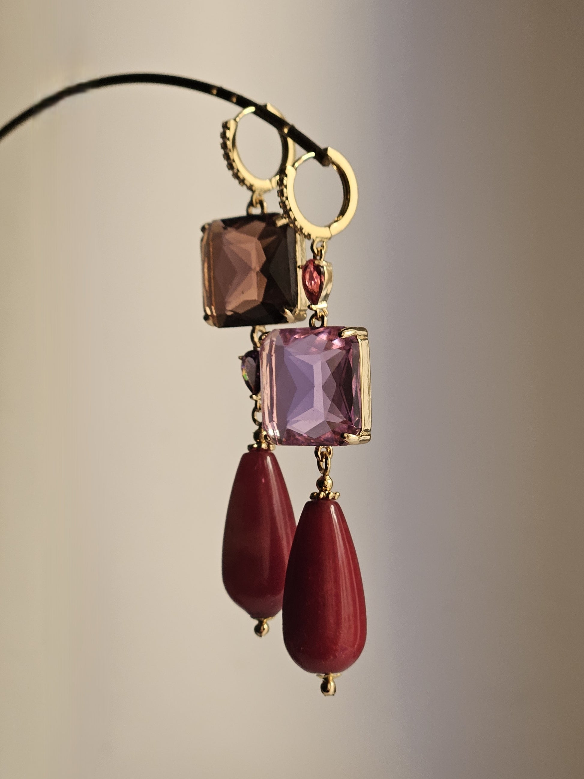 Orecchini con monachelle a cerchietto impreziositi da strass trasparenti, composti da due strass quadrati nei colori vino e glicine, arricchiti da piccoli strass a goccia declinati in nuances tra il viola e l'amaranto. Due gocce in agata nei toni dell'amaranto completano i pendenti.