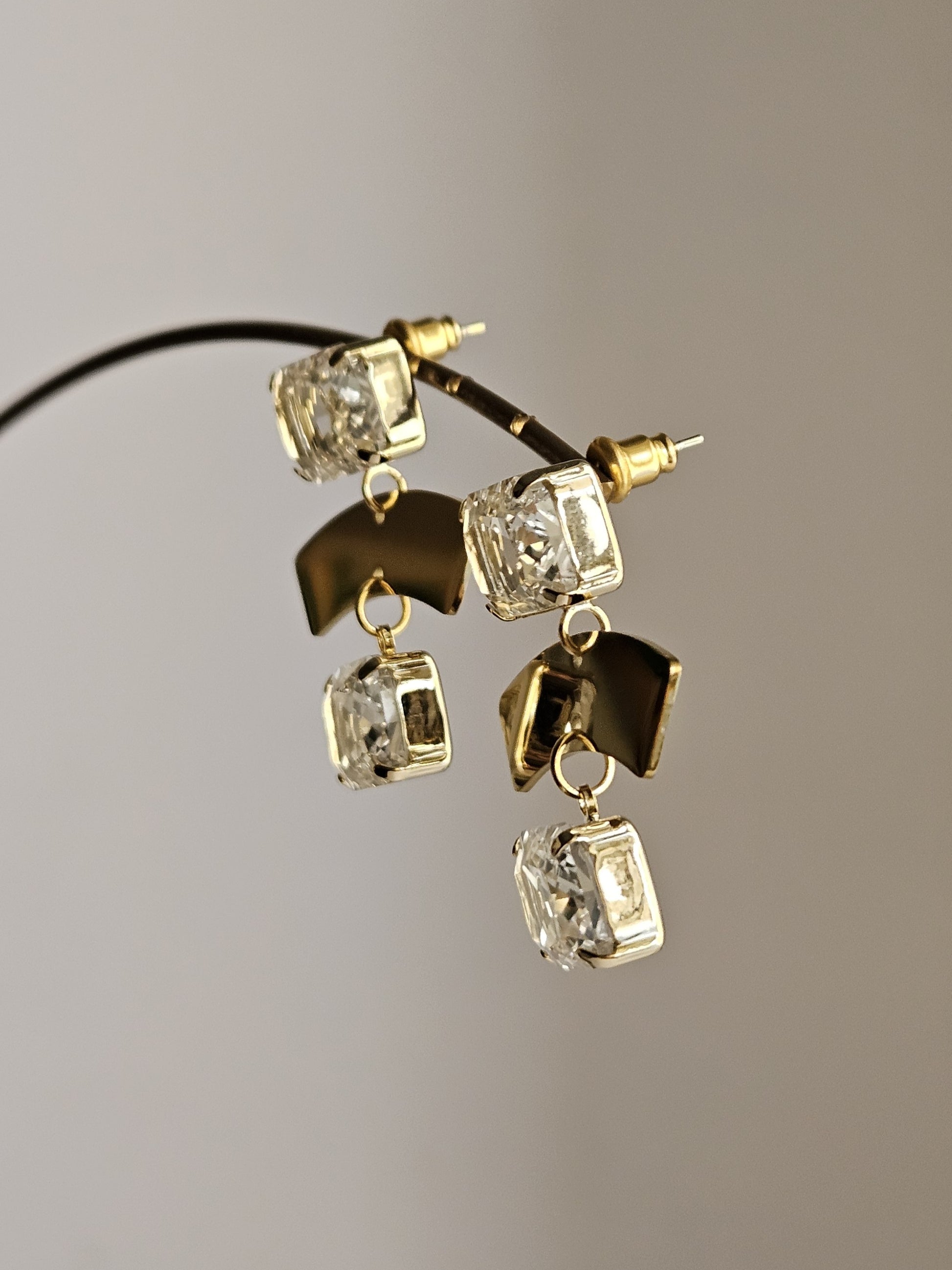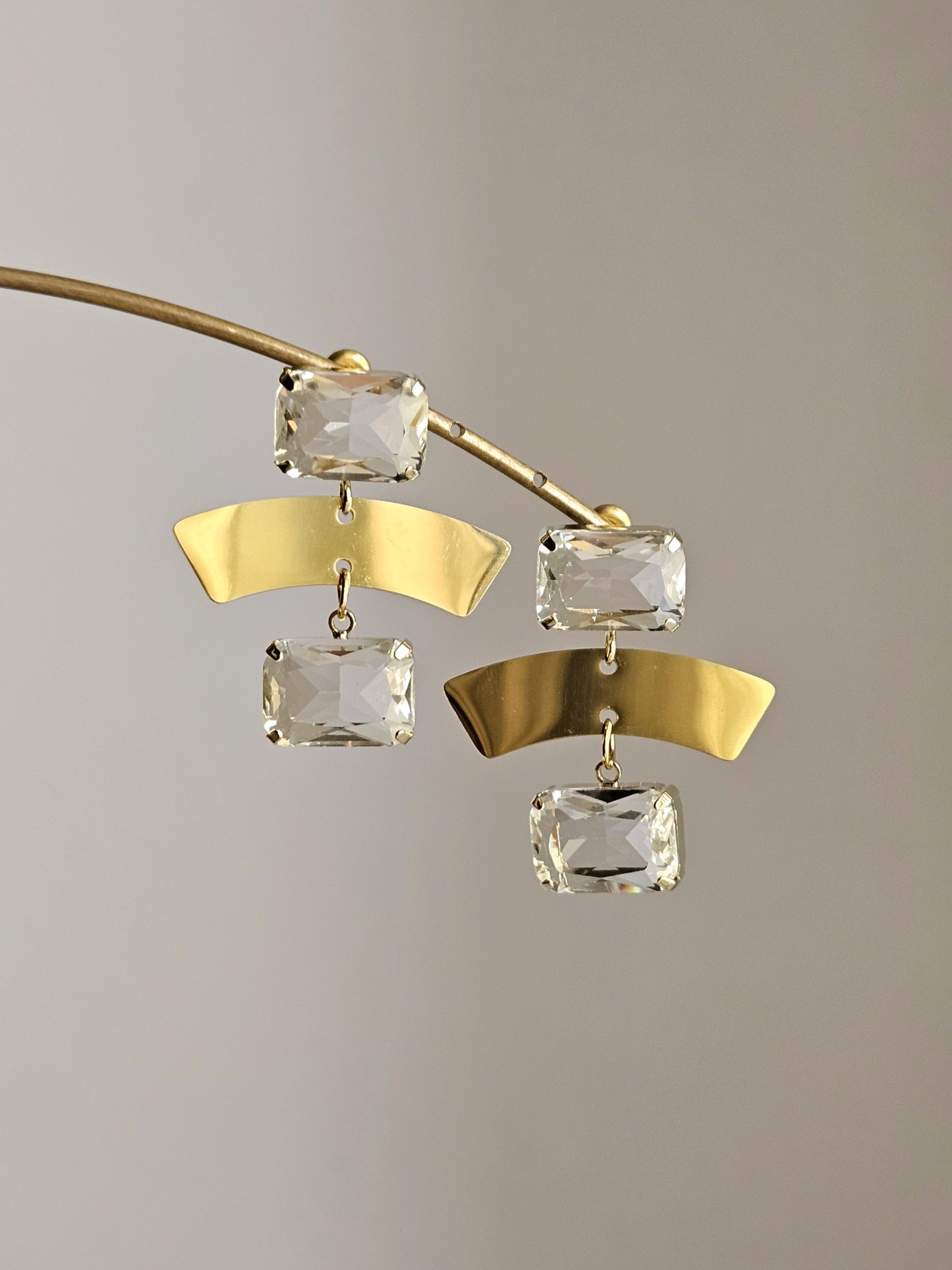 Orecchini a perno con strass rettangolari trasparenti a lobo, caratterizzati da due archi in acciaio dorato a profilo piatto, accompagnati da due strass rettangolari trasparenti finali.