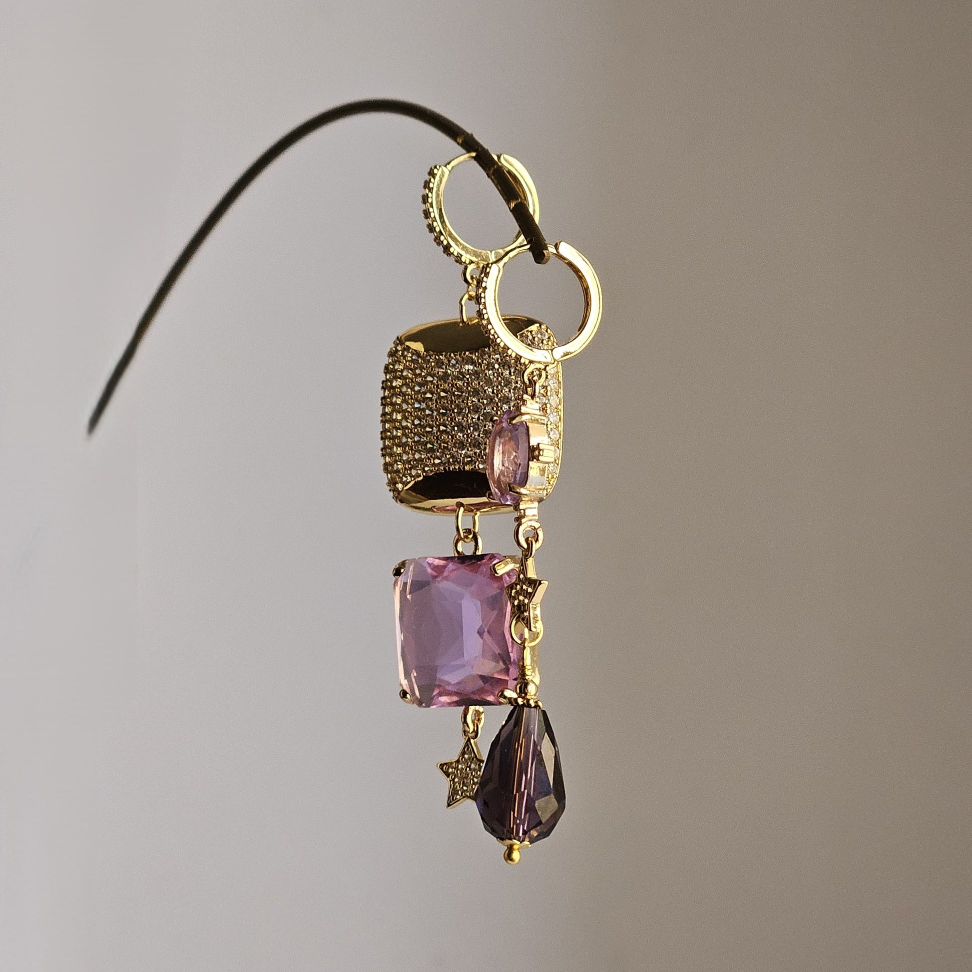 Orecchini con monachelle a cerchietto impreziositi da strass trasparenti, caratterizzati da due strass nei toni del glicine accompagnati da una stellina e un quadrato in ottone dorato, tutti e due arricchiti con strass trasparenti. Completano i pendenti una goccia in vetro sfaccettato di colore viola ed una stellina.