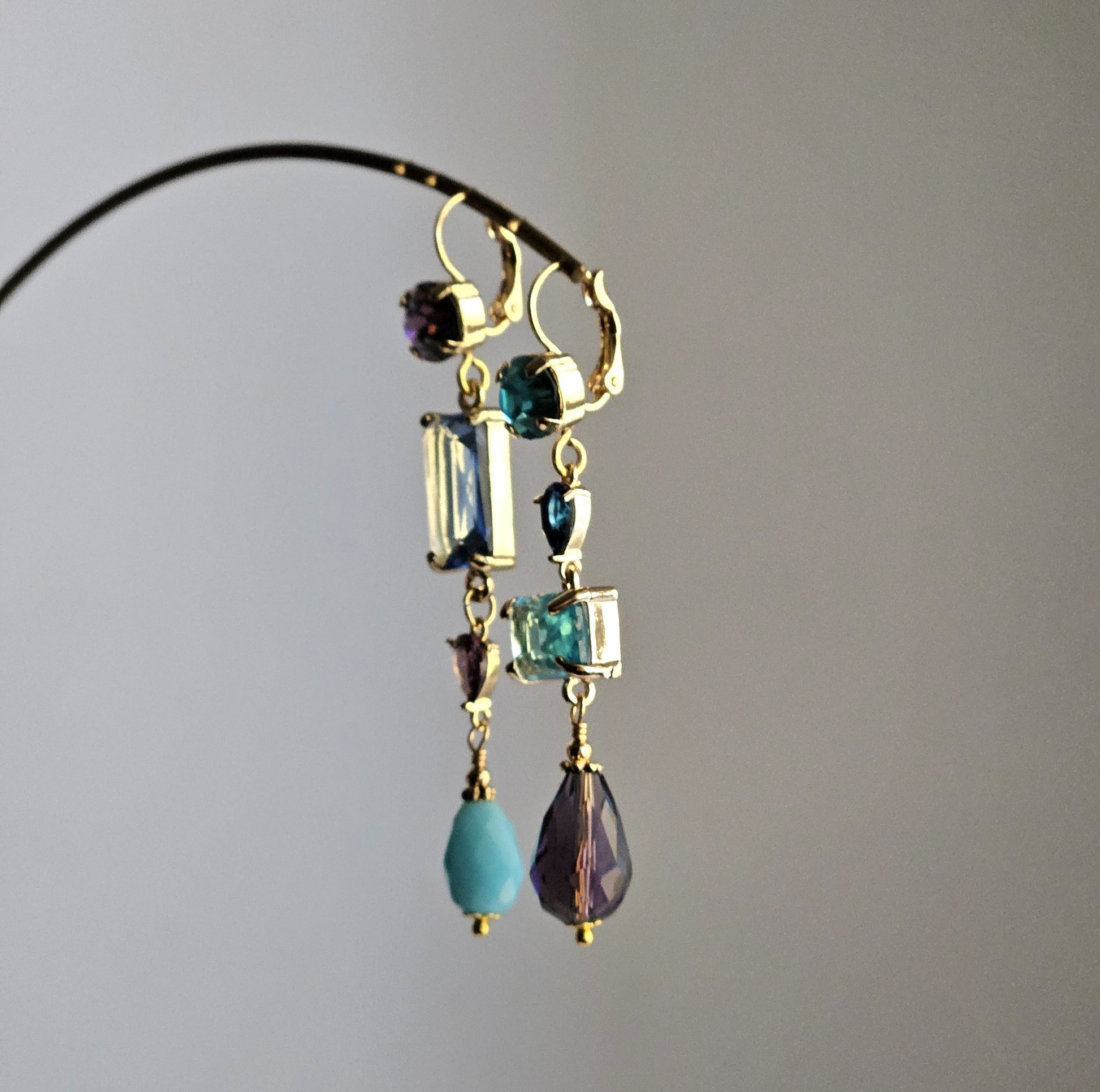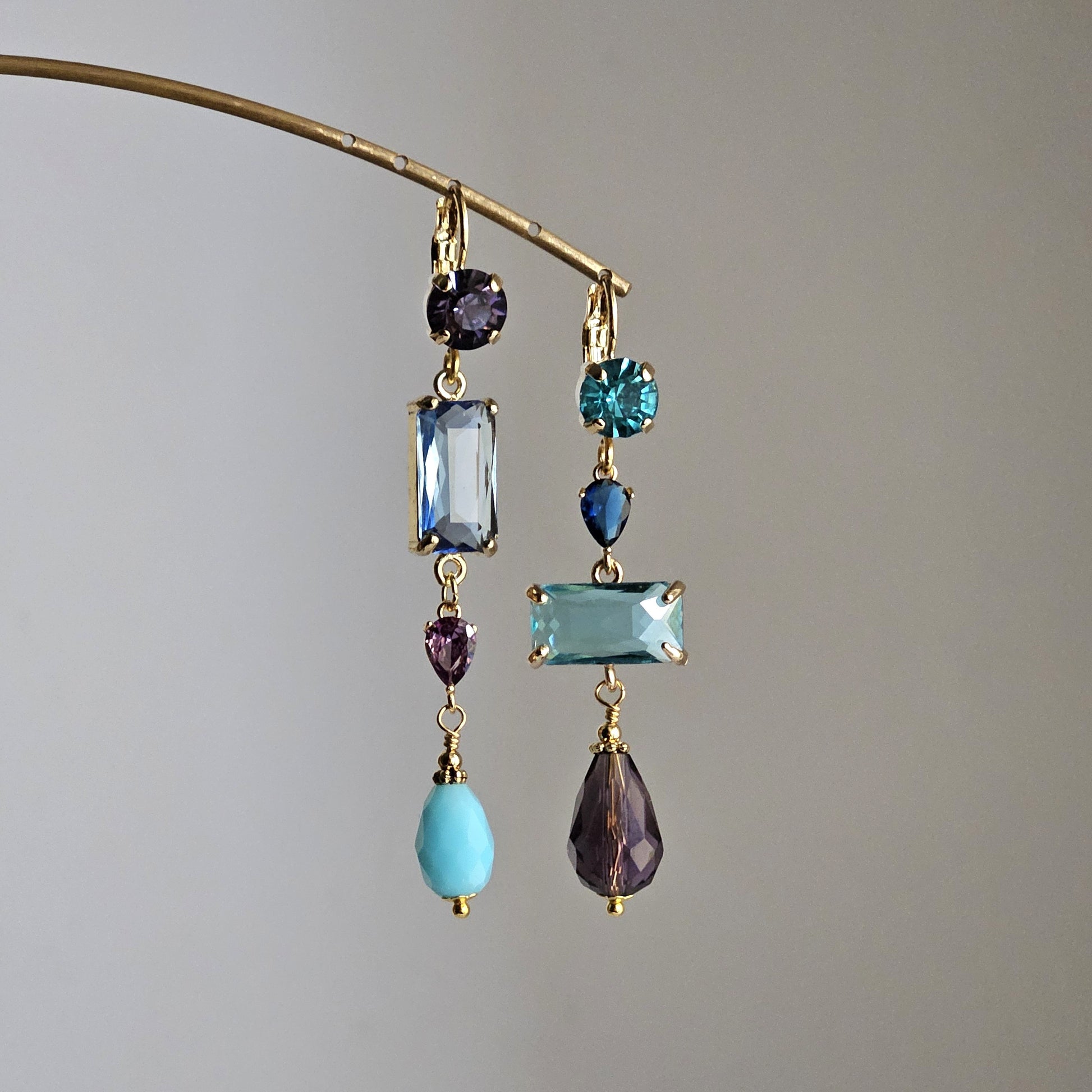 Orecchini con chiusura con monachella a scatto impreziositi da strass tondi nei colori turchese e viola a lobo, caratterizzati da due strass rettangolari nei toni del turchese e del blu acqua, accompagnati da due piccoli strass a goccia nei colori blu e viola. Due gocce in vetro sfaccettato di colore viola e turchese completano il design.