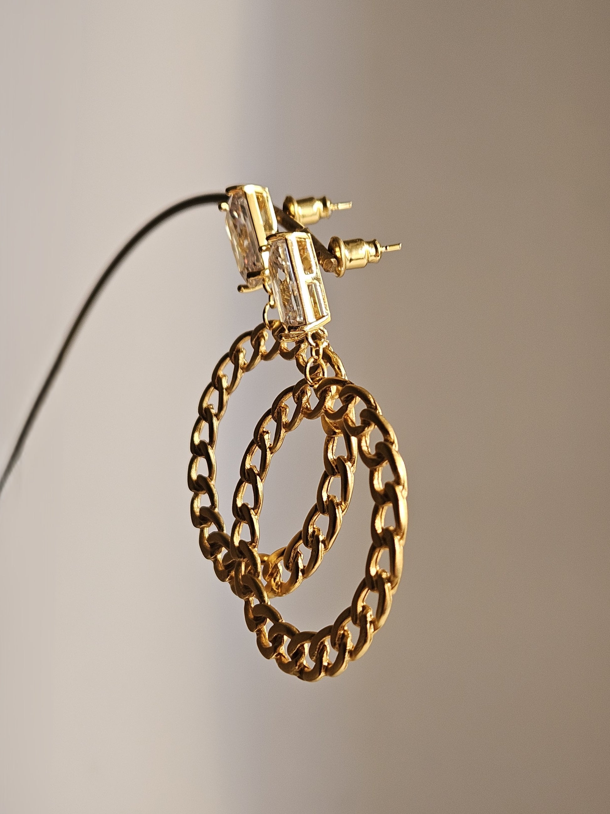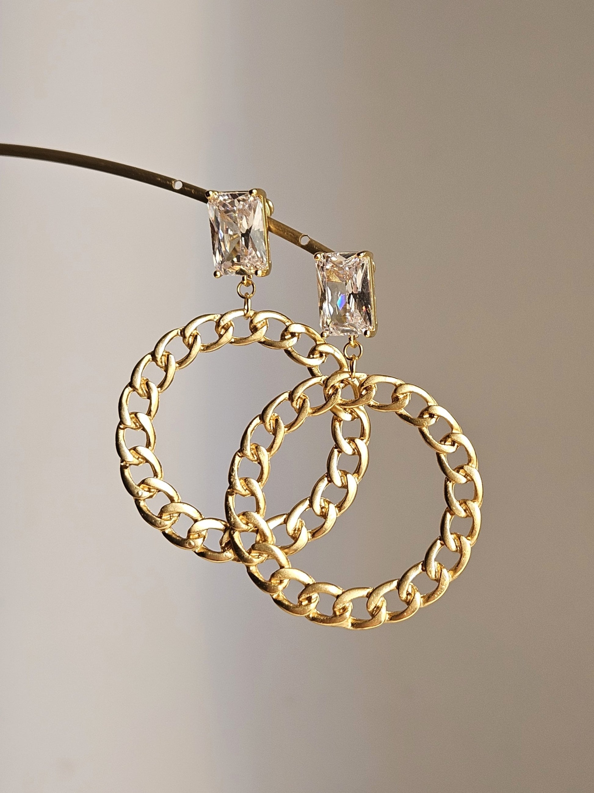 Orecchini a perno con strass rettangolari trasparenti a lobo, abbinati a un pendente tondo in metallo dorato a maglia catena di diametro 3.8 cm.