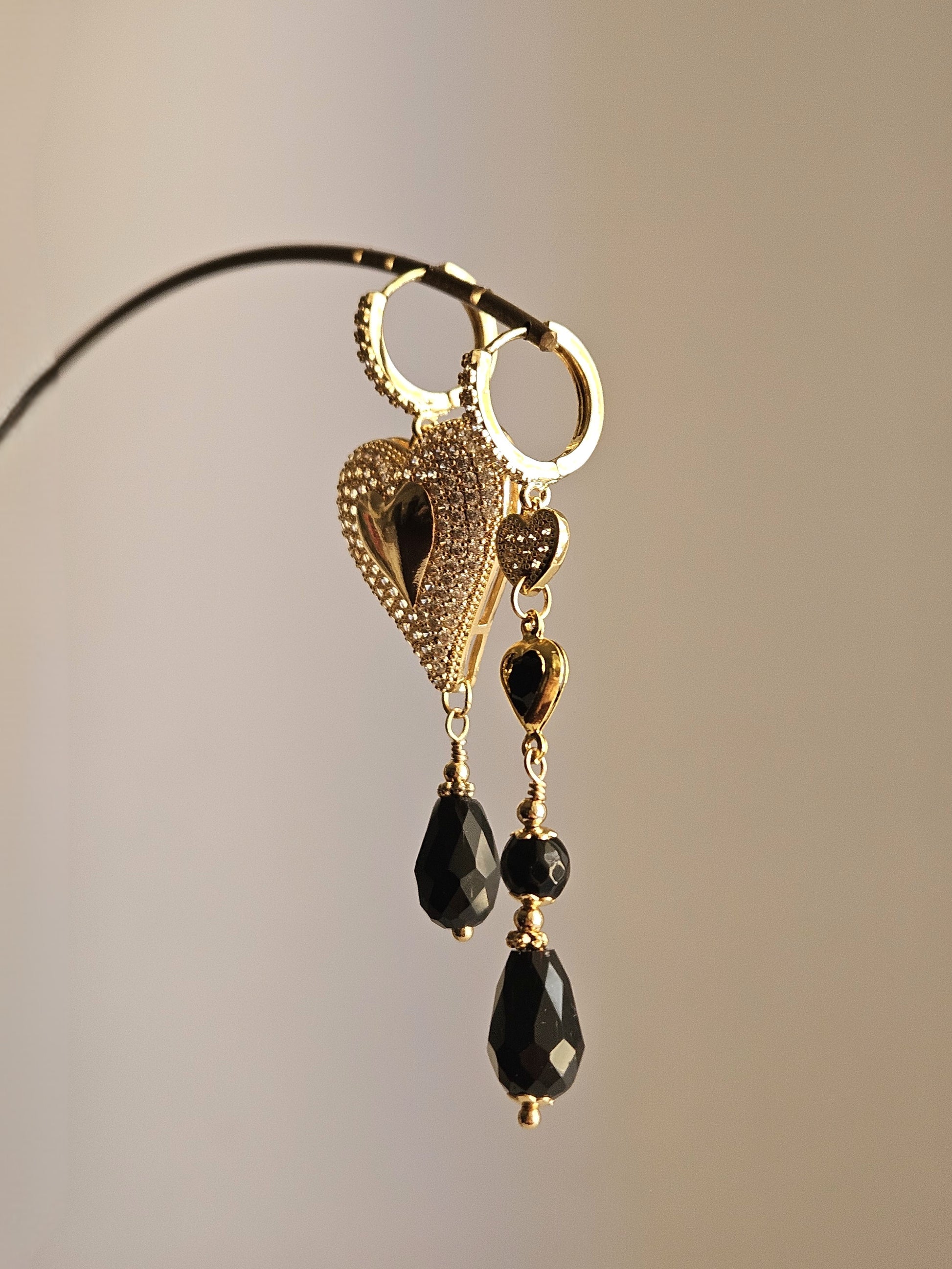 Orecchini con monachelle a cerchietto impreziositi da strass trasparenti, caratterizzati da un cuore in acciaio dorato decorato con strass trasparenti accompagnato da una goccia in vetro sfaccettato di colore nero; l'altro pendente è formato da un cuoricino in ottone dorato con strass trasparenti ed uno strass a cuore di colore nero, una goccia in vetro sfaccettato ed una pietra tonda in agata, tutte e due di colore nero completano il pendente.