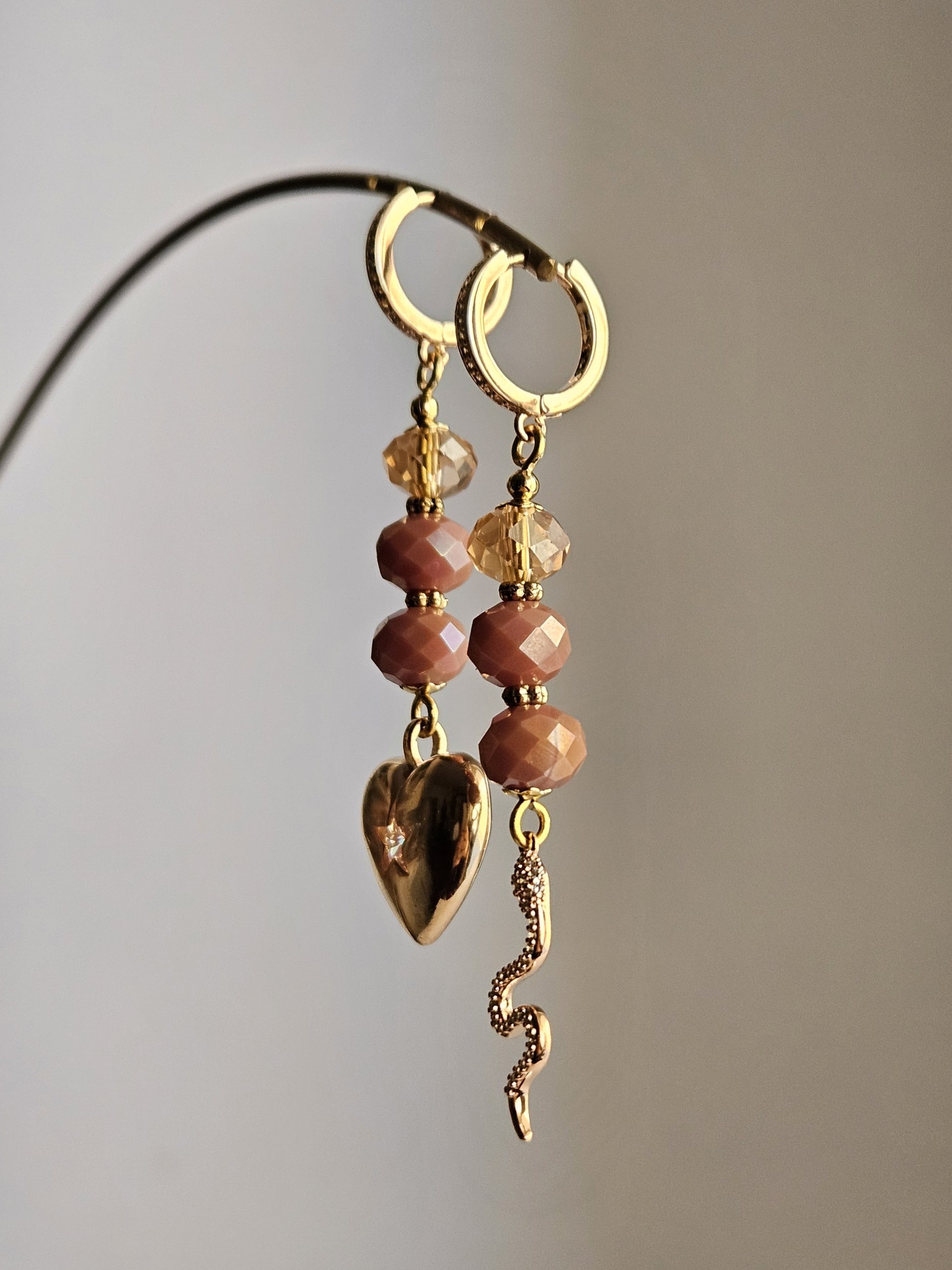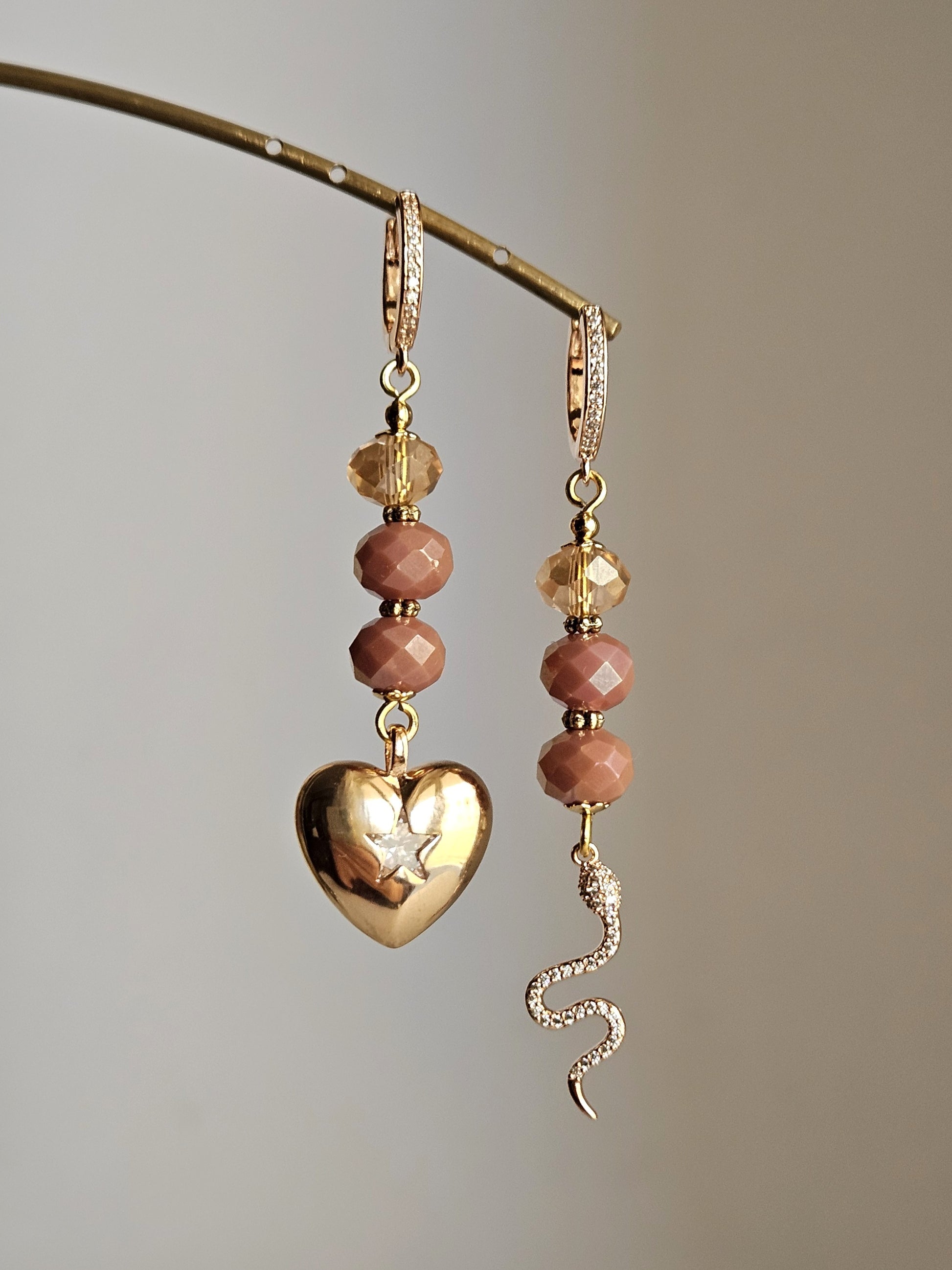 Componenti: tris di pietre in vetro sfaccettato nei toni del rosa antico; cuore in ottone dorato con strass trasparente a forma di stella; snake in ottone dorato arricchito da strass trasparenti.