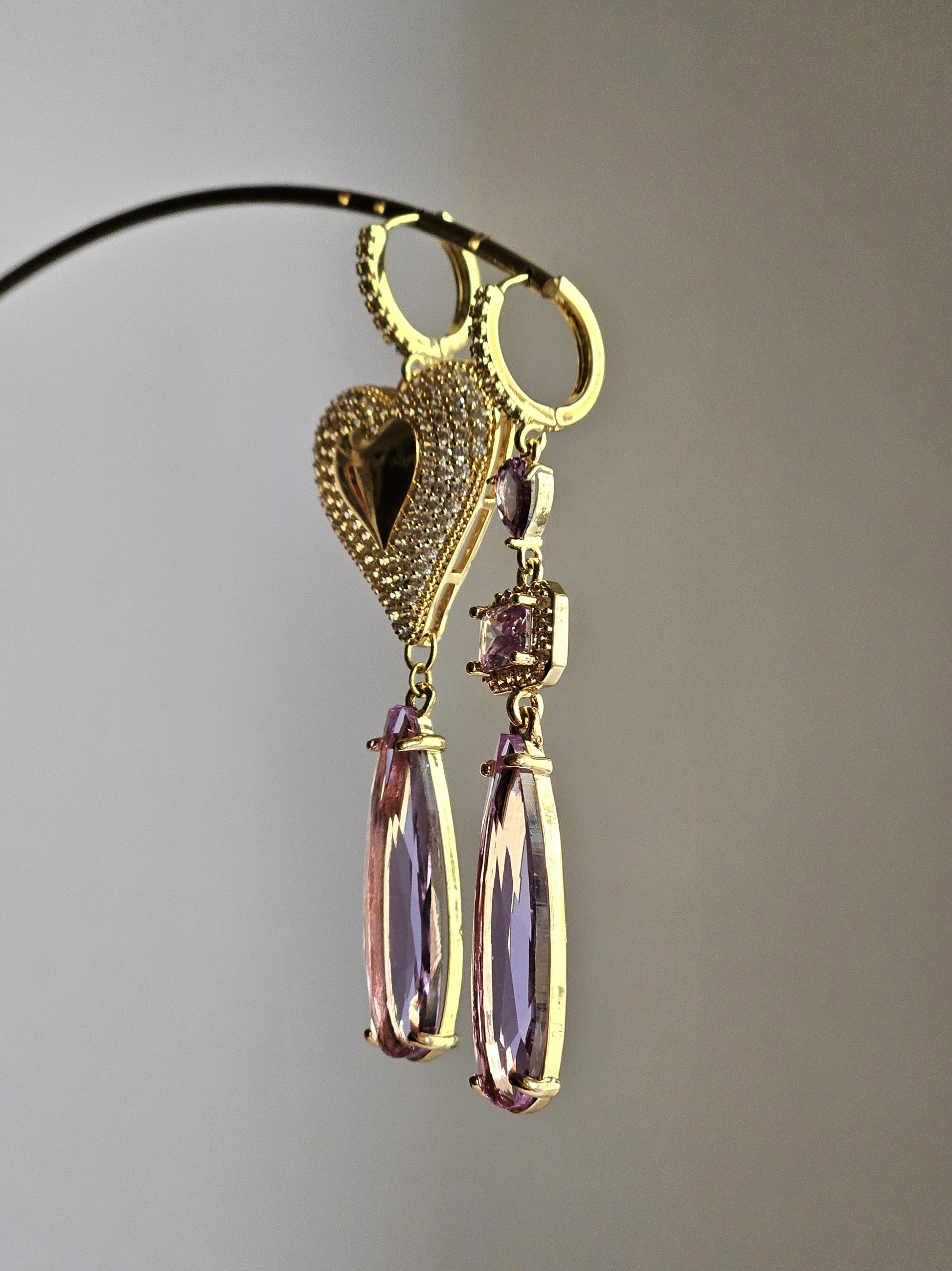 Orecchini con monachelle a cerchietto impreziositi da strass trasparenti, caratterizzati da un cuore in acciaio dorato, decorato con strass trasparenti e da un piccolo strass a goccia di colore viola accompagnato da uno strass rettangolare di colore glicine. Due strass a goccia lunga sempre nei toni del glicine completano i pendenti.