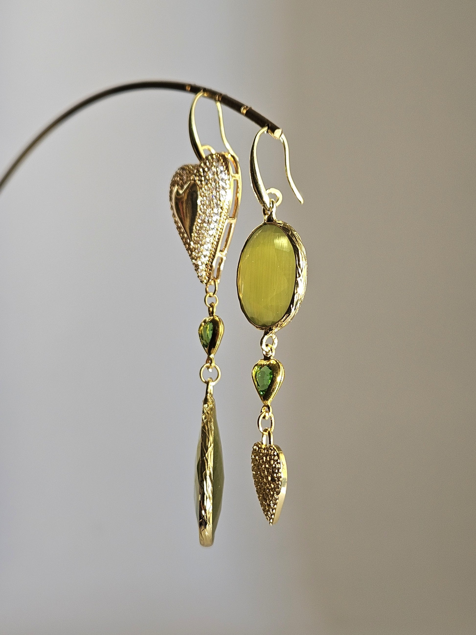 Componenti: cuore grande in acciaio dorato decorato con strass trasparenti; coppia di strass a cuore di colore verde; pendente grande a goccia e connettore tondo in pietra sfaccettata di colore verde mela; cuore finale in ottone dorato impreziosito da strass trasparenti.