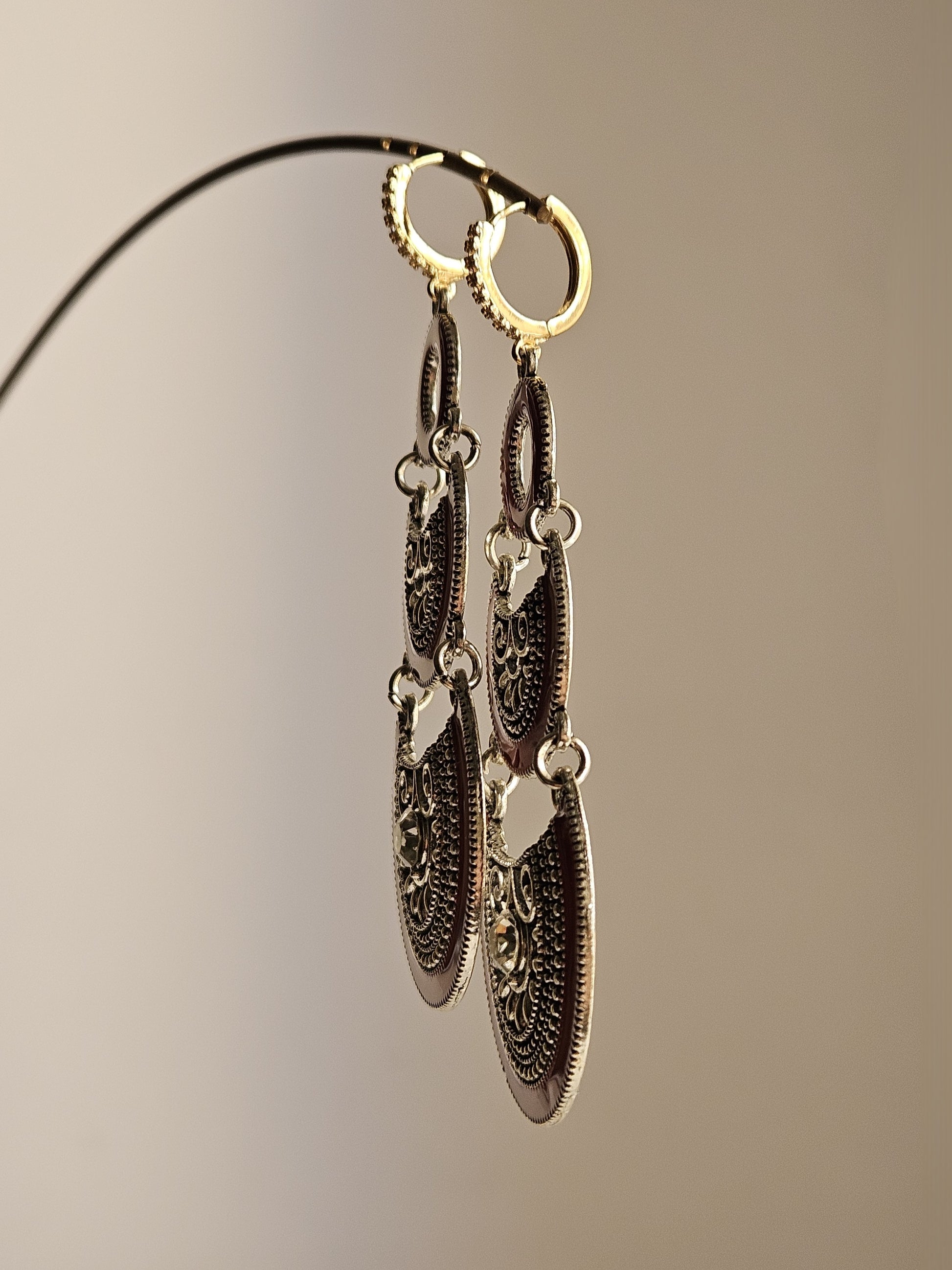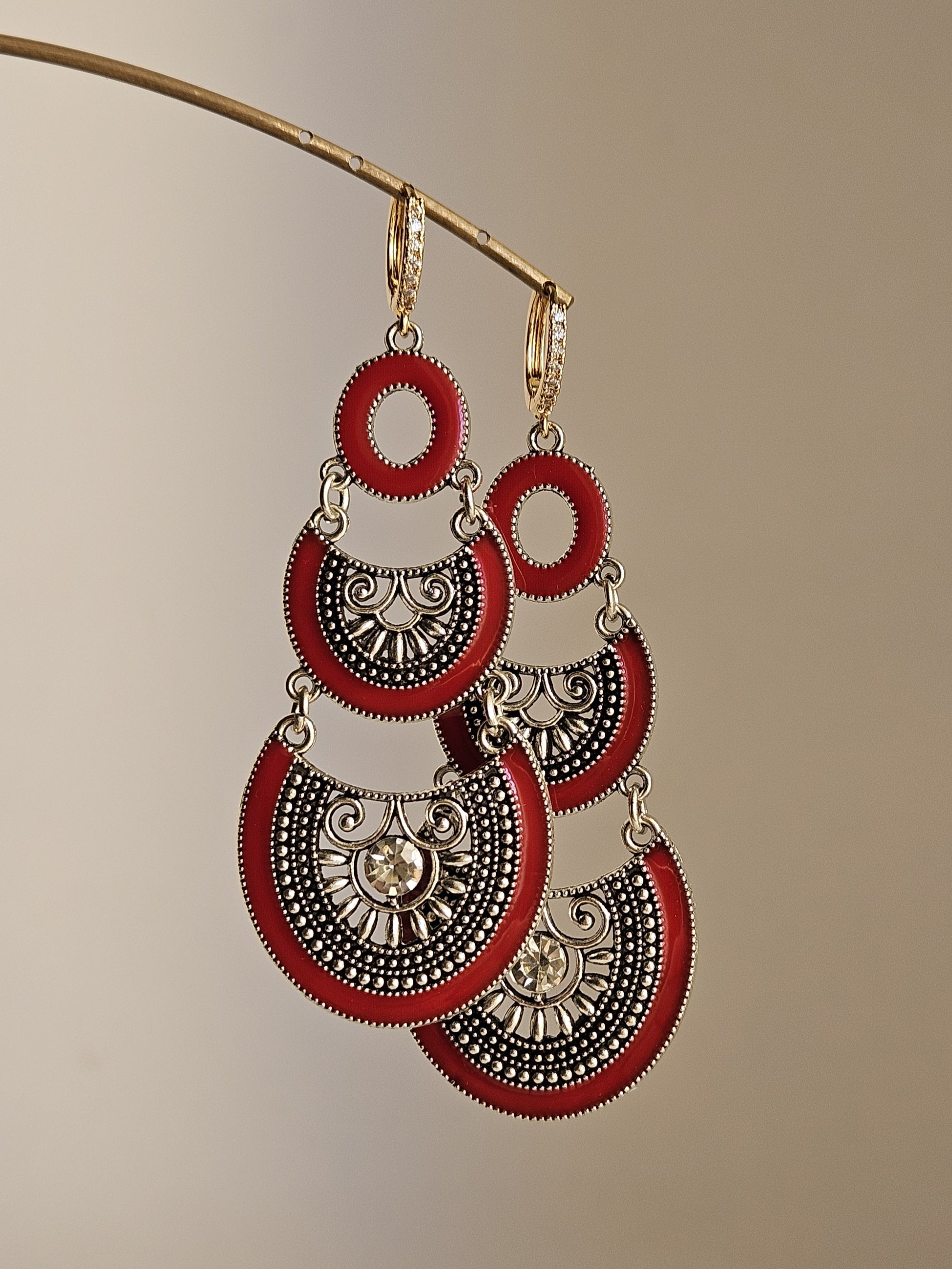 Orecchini con monachelle a cerchietto con strass trasparenti a lobo, caratterizzati da un tondo e due semilune in metallo color argento anticato con decori smaltati di colore rosso bordeaux.