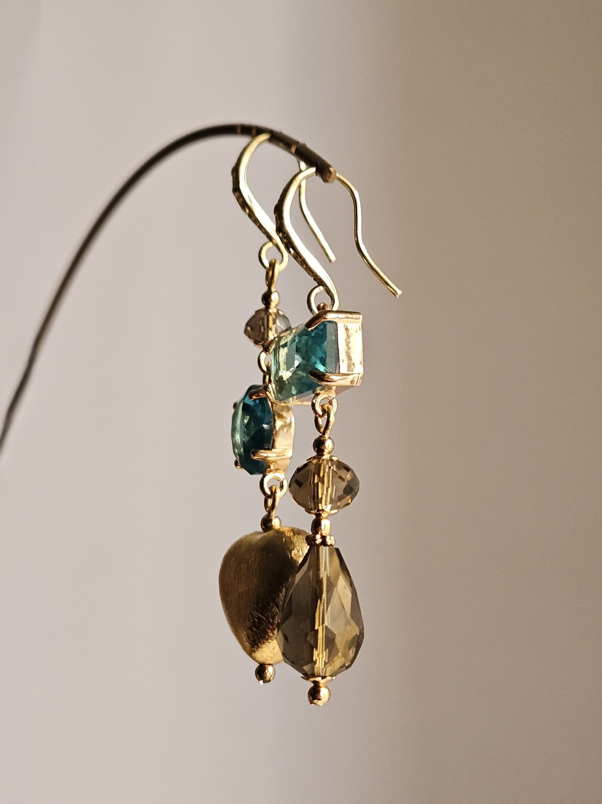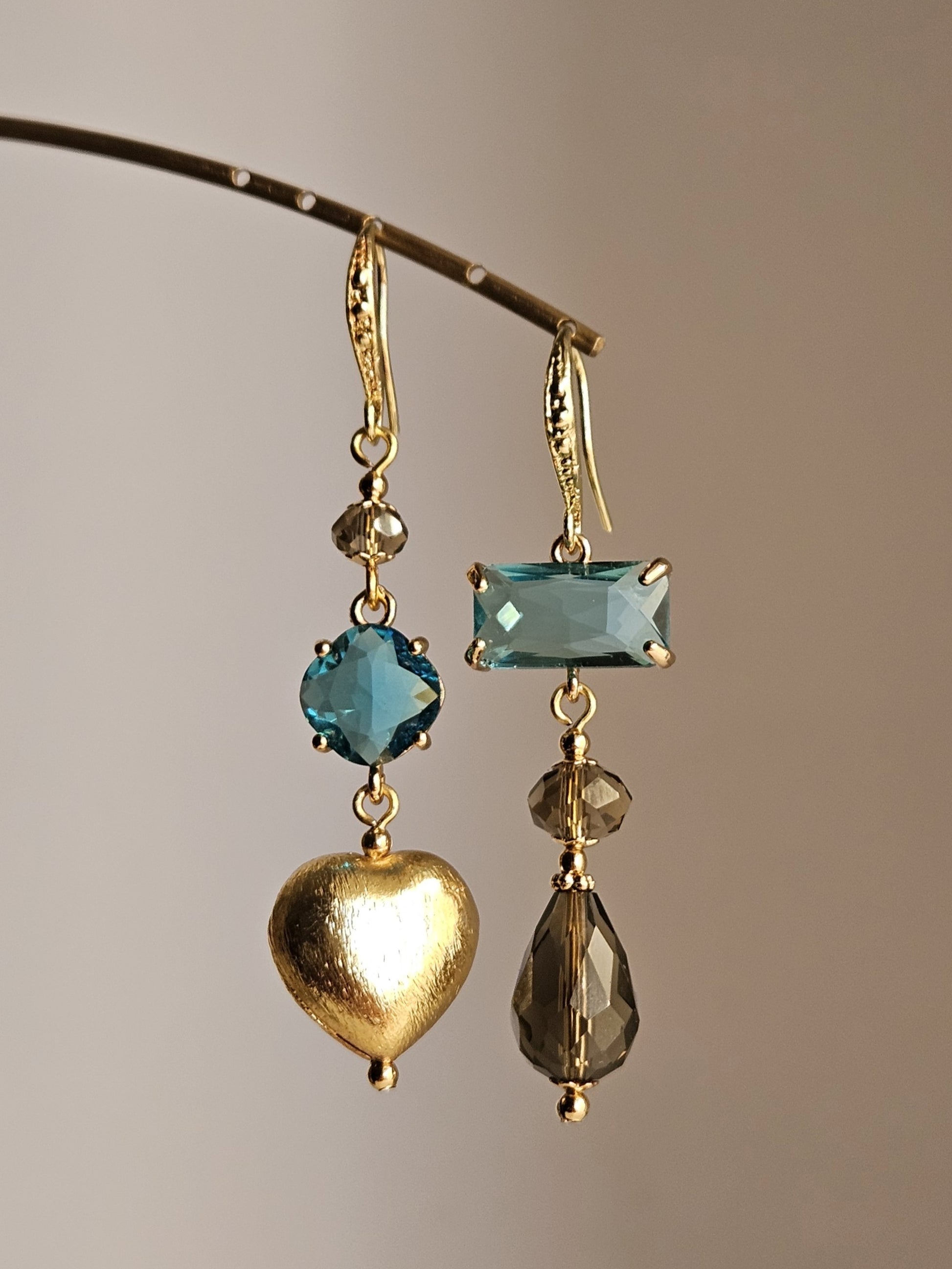 Componenti: strass rettangolare e strass tondo, tutti e due di colore turchese; pietre tonde in vetro sfaccettato nei toni del fango; cuore finale in ottone dorato satinato; goccia finale in vetro sfaccettato di colore fango.