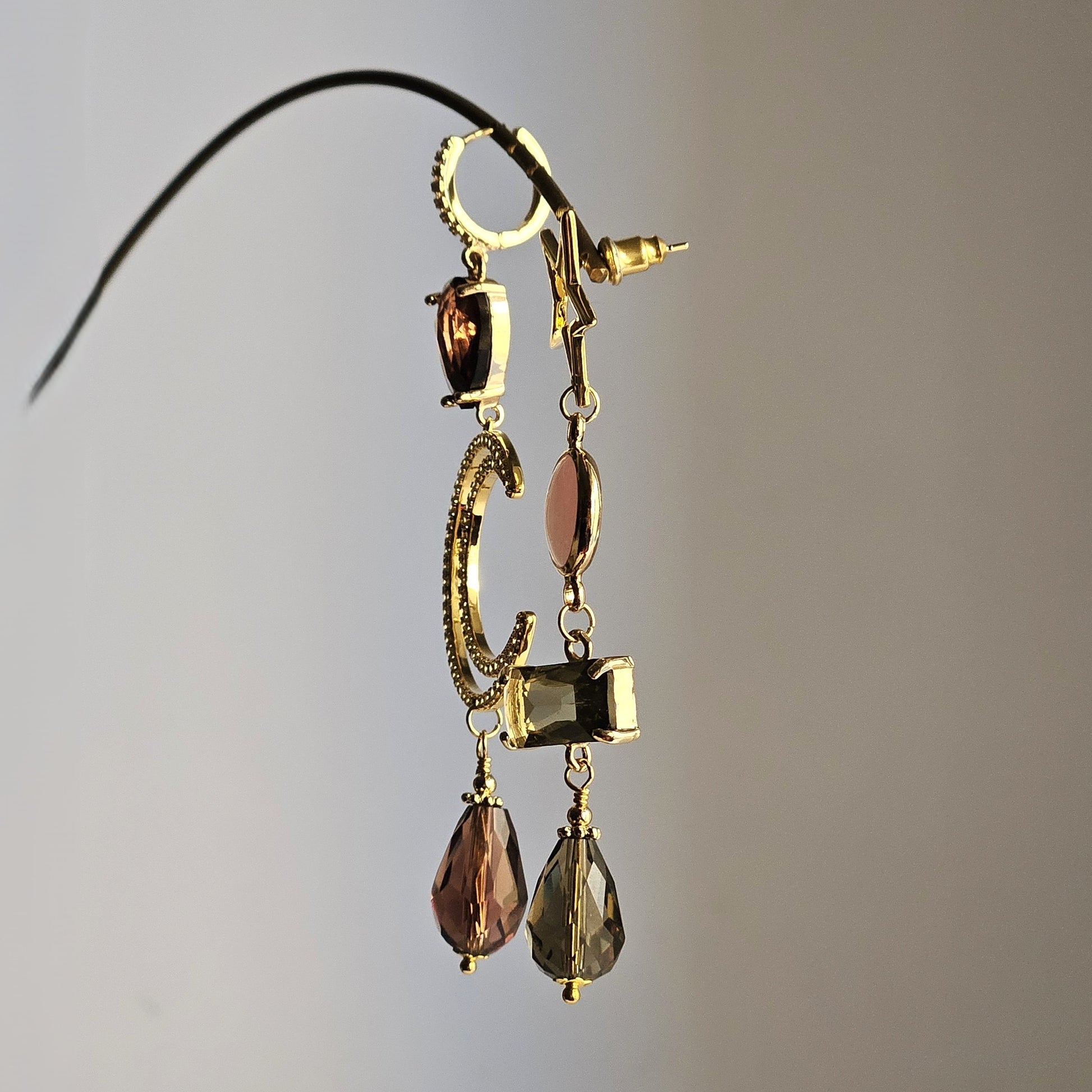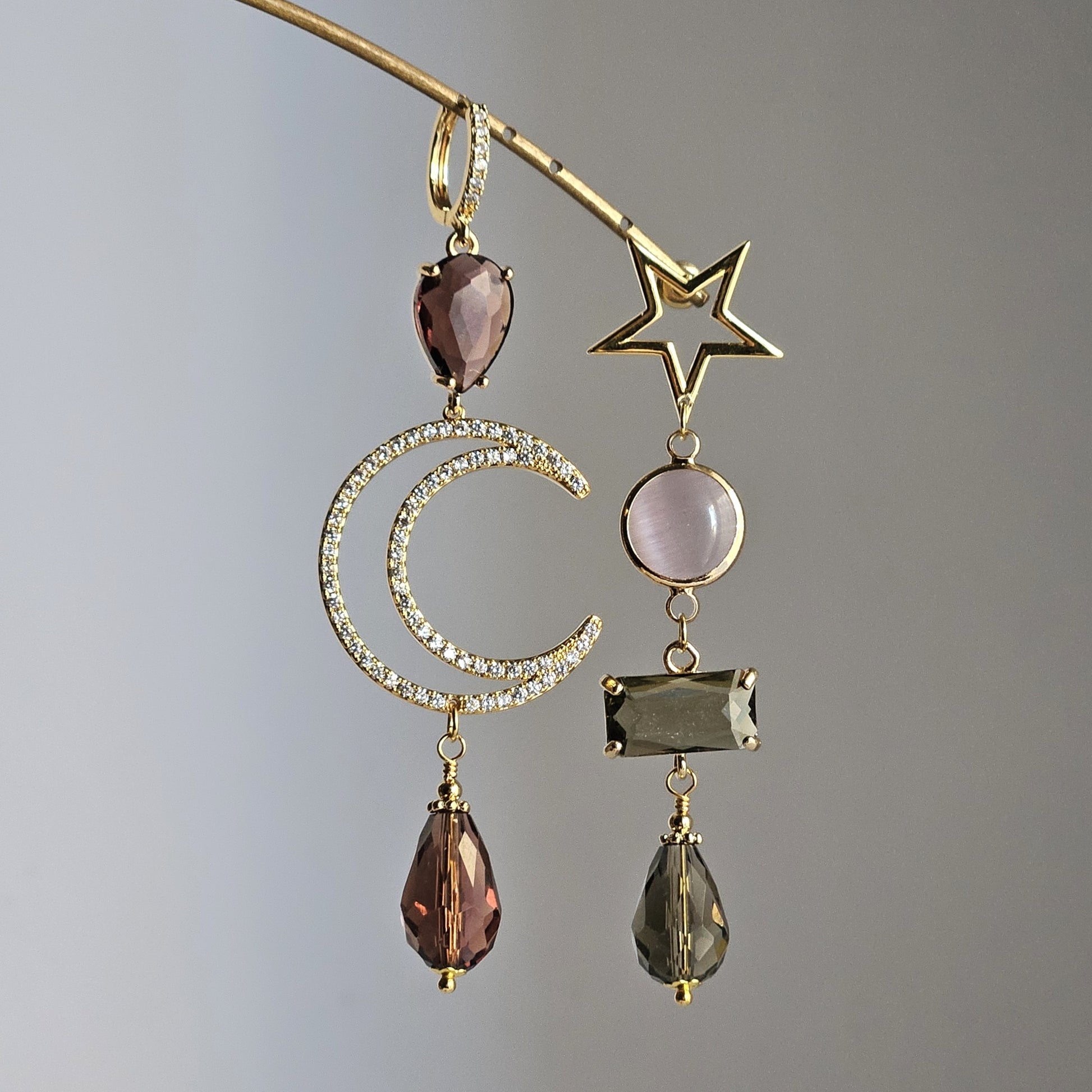 Orecchini con attacco misto a lobo consistenti in una stella filo con perno e una monachella a cerchietto con strass trasparenti, tutti e due in ottone dorato, i pendenti sono caratterizzati da tre strass nei colori fango, vino e rosa polvere, accompagnati da una luna filo impreziosita da strass trasparenti. Completano il design due gocce in vetro sfaccettato nei colori vino e fango.