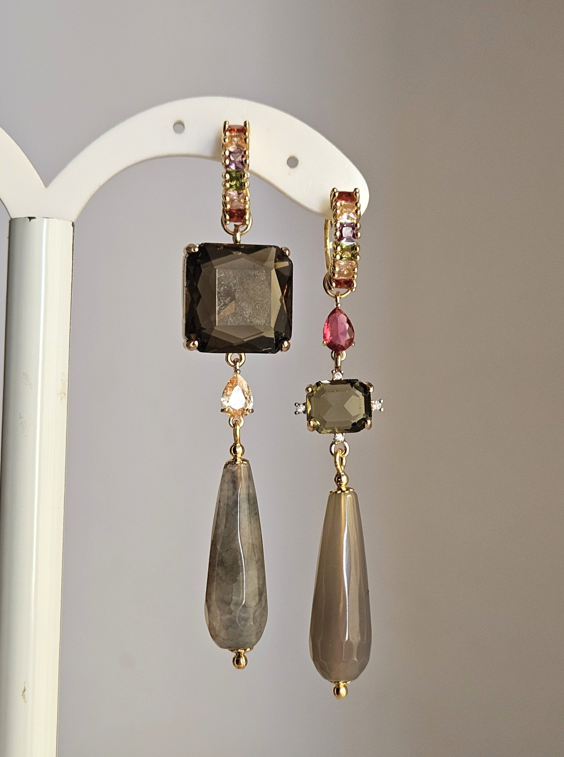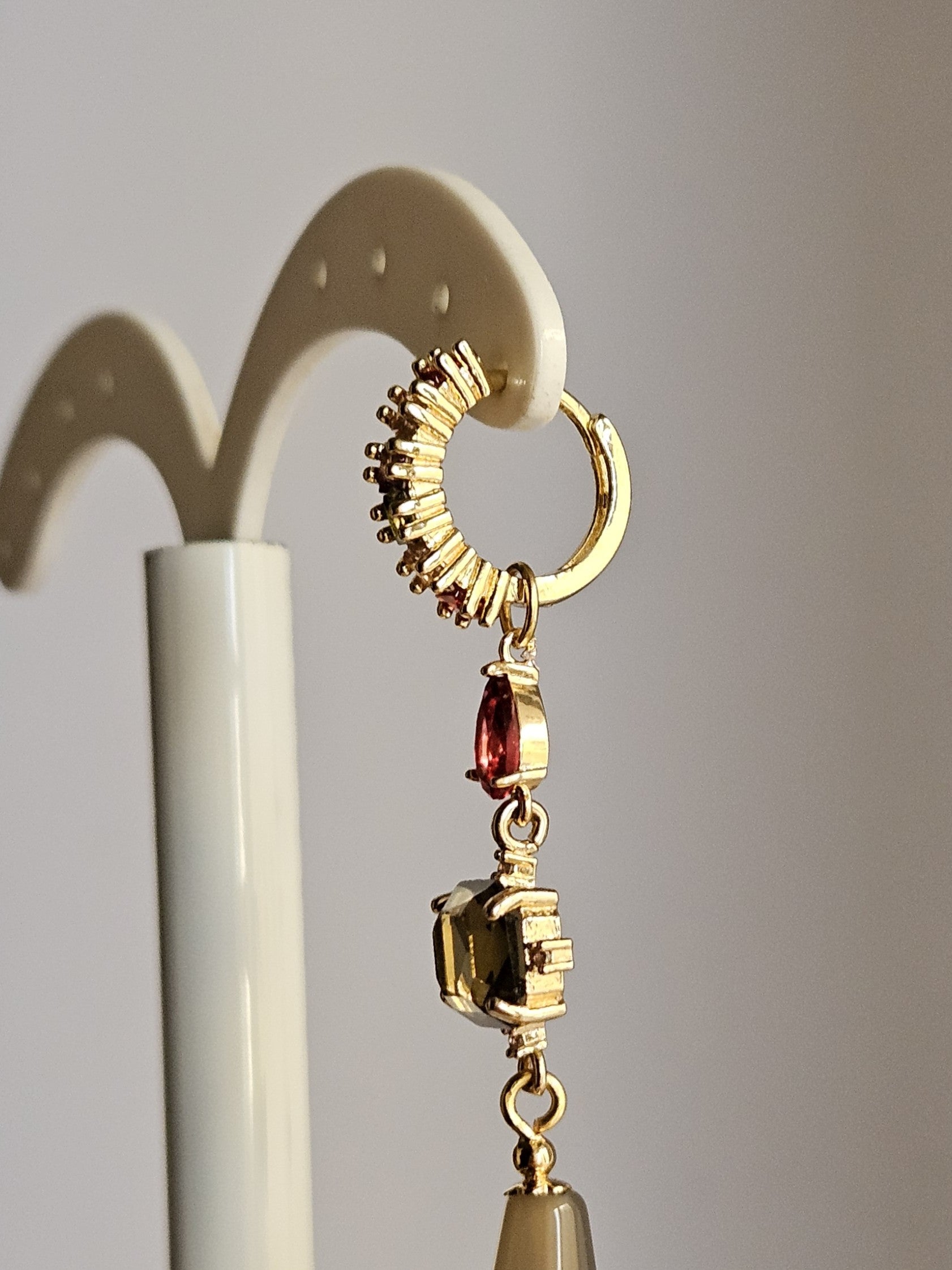 Orecchini con monachelle a cerchietto con strass multi color a lobo, caratterizzati da strass intermedi composti da uno strass quadrato grande e uno rettangolare, tutti e due nei toni del fango, accompagnati da due strass a goccia piccola nei colori amaranto e vaniglia. Completano il design due gocce in agata color fumo.