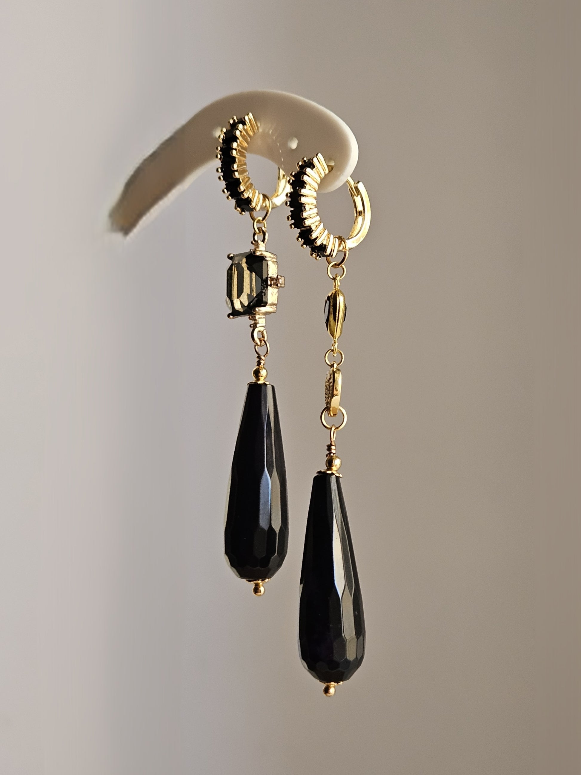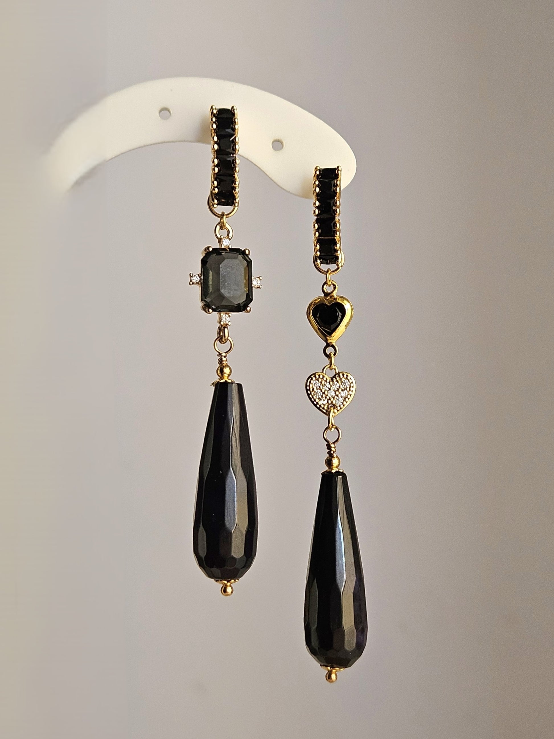 Componenti: strass rettangolare colore grigio fumo; strass a cuore colore nero; cuoricino in ottone dorato con strass trasparenti; gocce in agata colore nero.