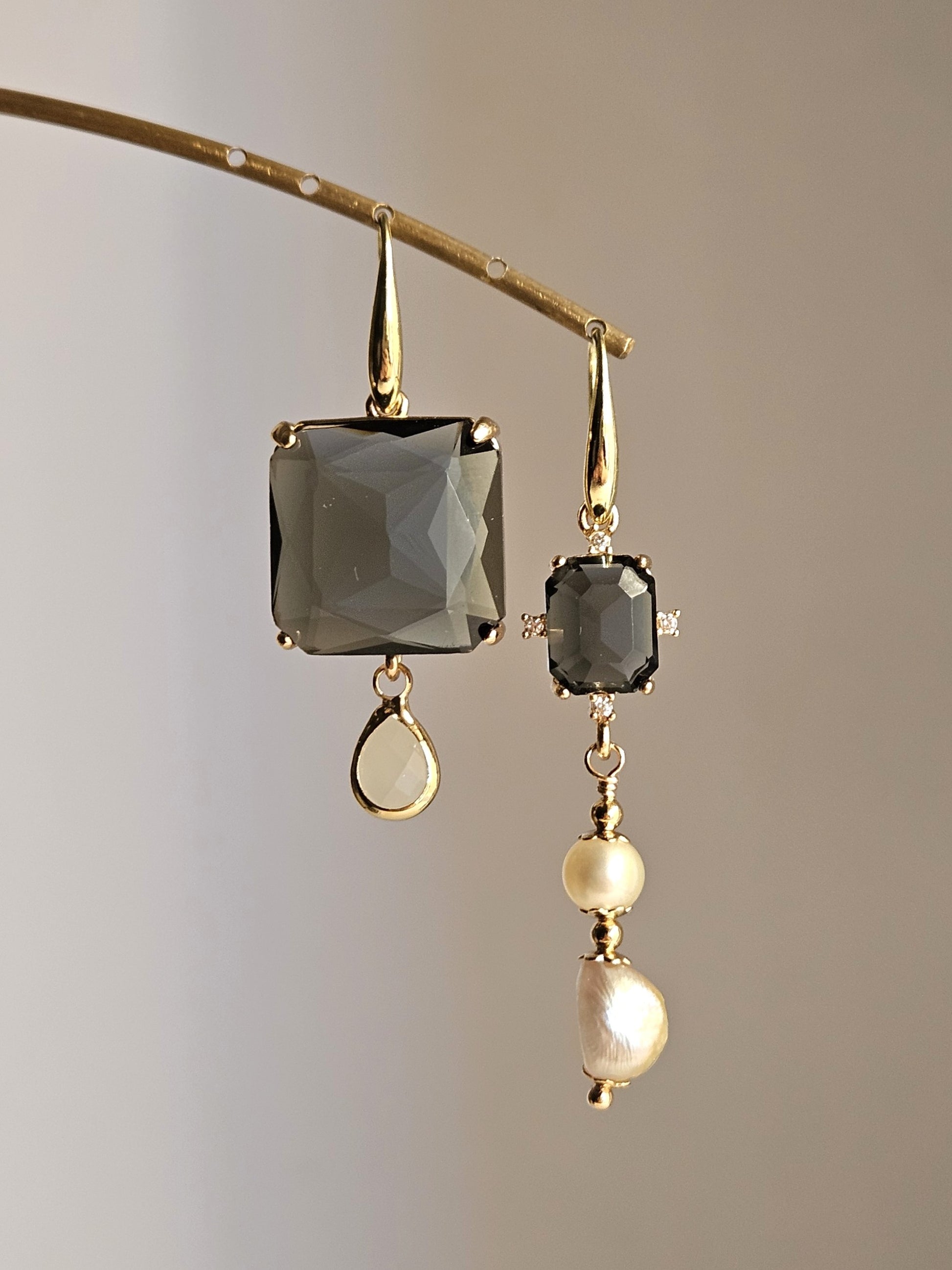 Componenti: strass rettangolare e quadrato grande di colore grigio fumo; due perle scaramazze (a goccia e tonda); goccina strass di colore bianco latte.