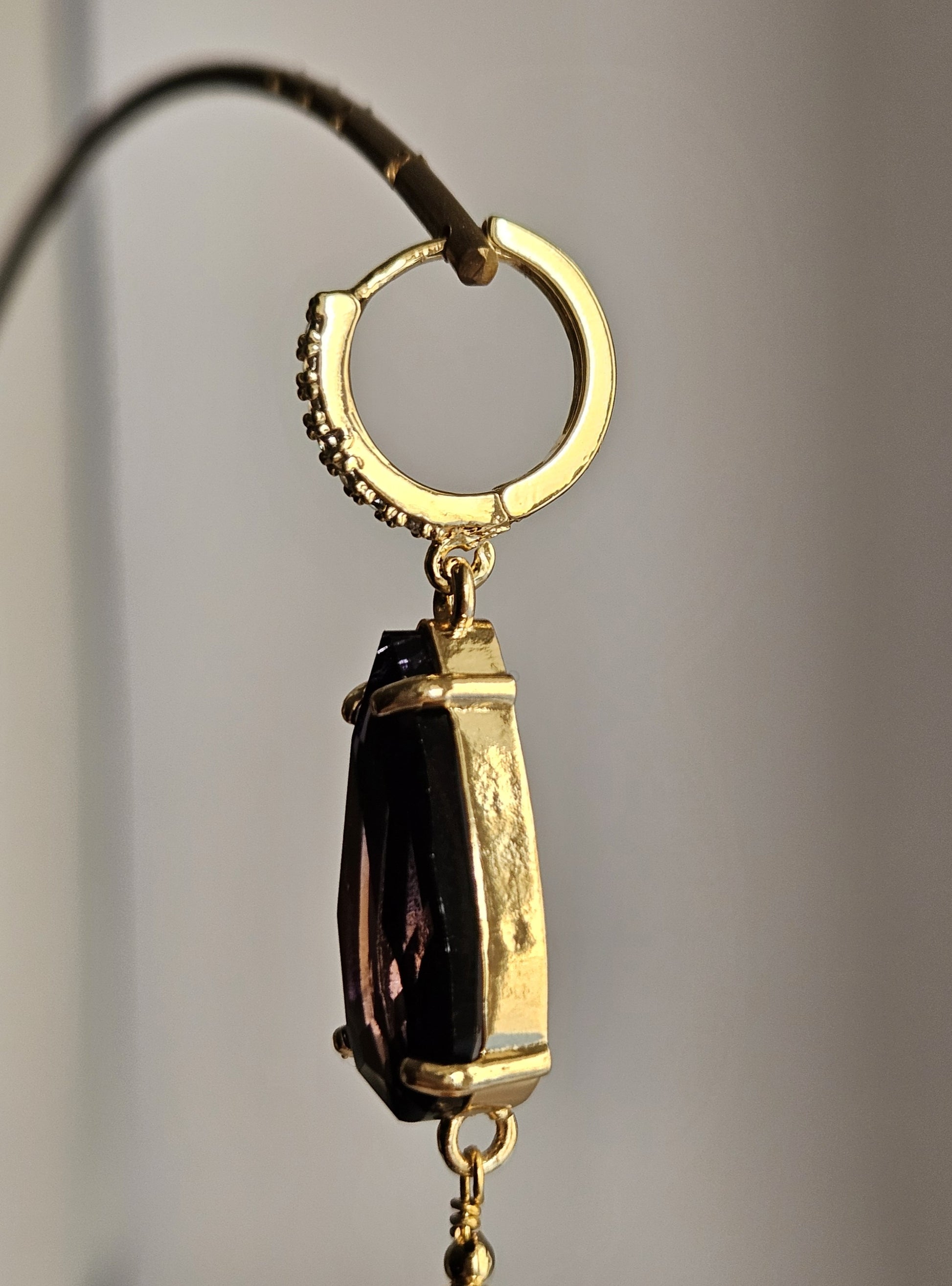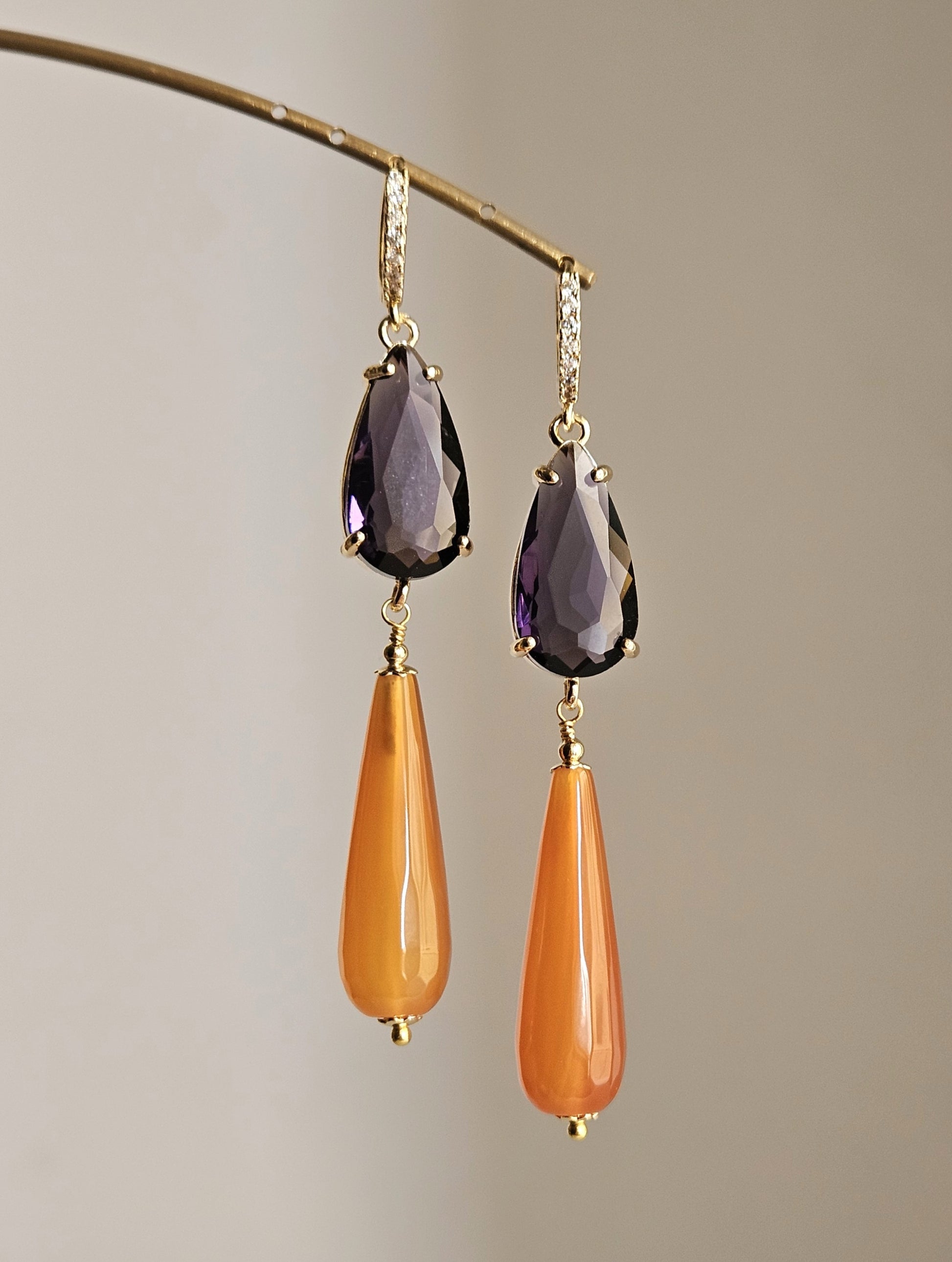 Orecchini con monachelle a cerchietto con strass trasparenti a lobo, composti da due strass a forma di goccia di colore viola mirtillo e da due gocce lunghe in agata nei toni del giallo miele.