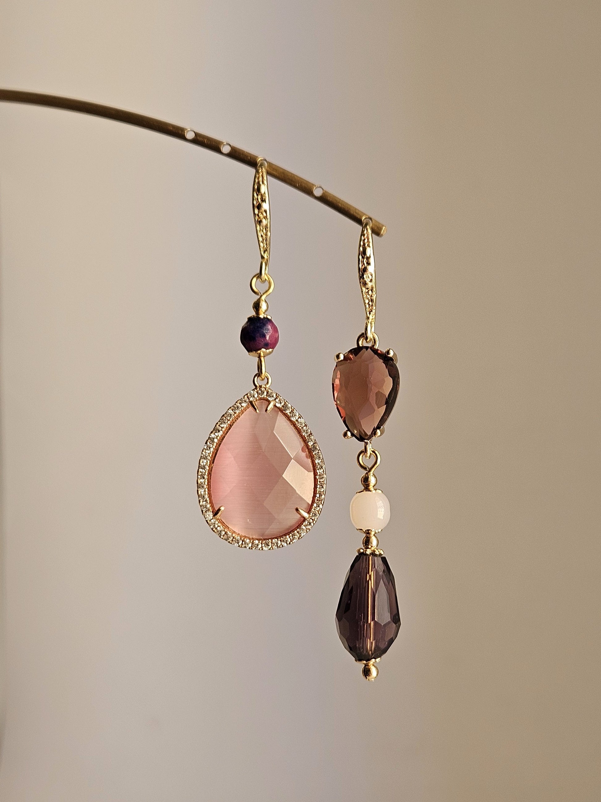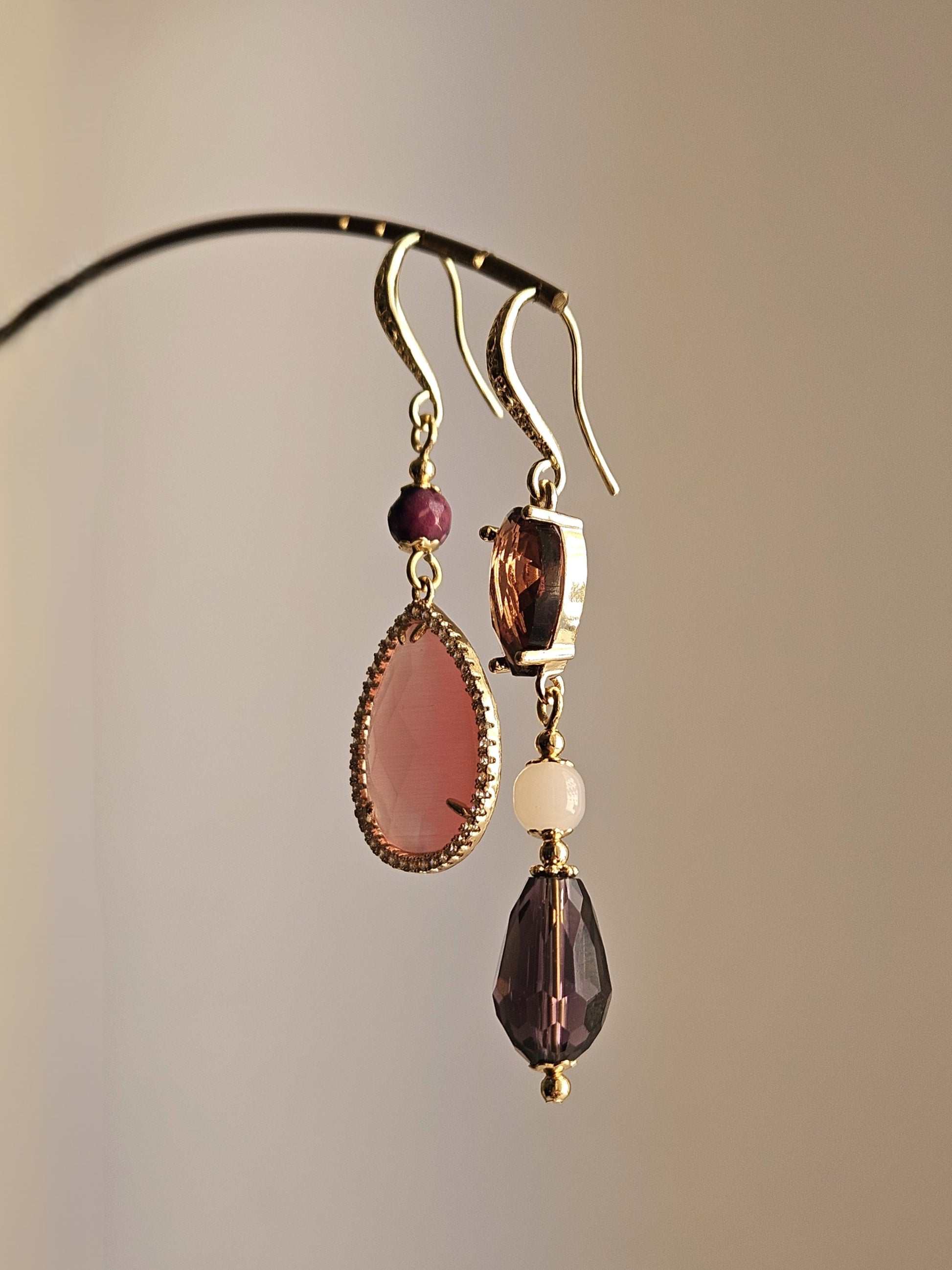 Orecchini con ami lavorati con effetto diamantato in ottone dorato, composti da uno strass grande a goccia di colore rosa peonia ed una pietra tonda in agata viola, l'altro pendente è composto da uno strass a goccia nei toni del prugna; completano il pendente una goccia in vetro sfaccettato sempre di colore prugna e una pietra tonda in agata di colore rosa peonia.