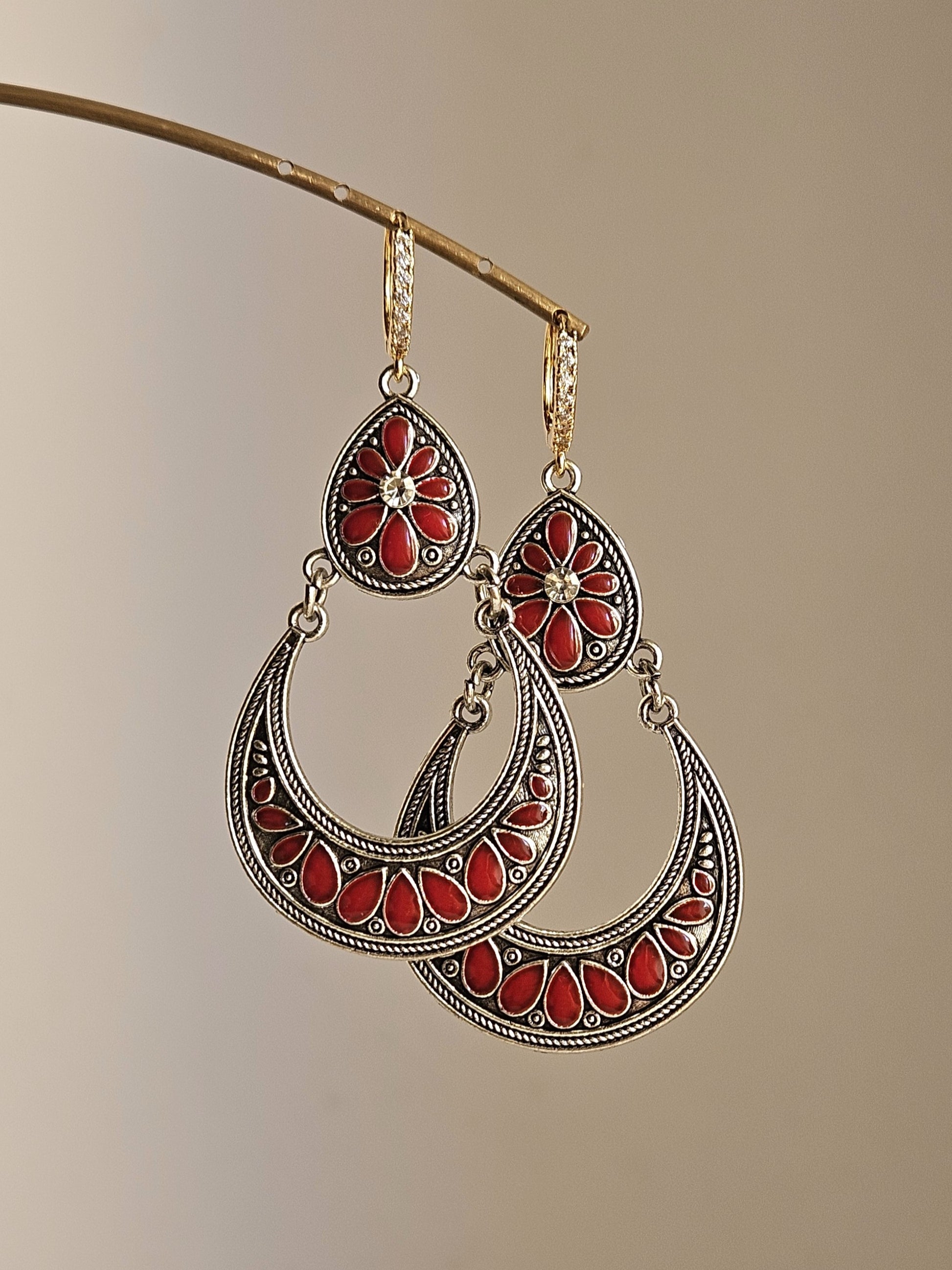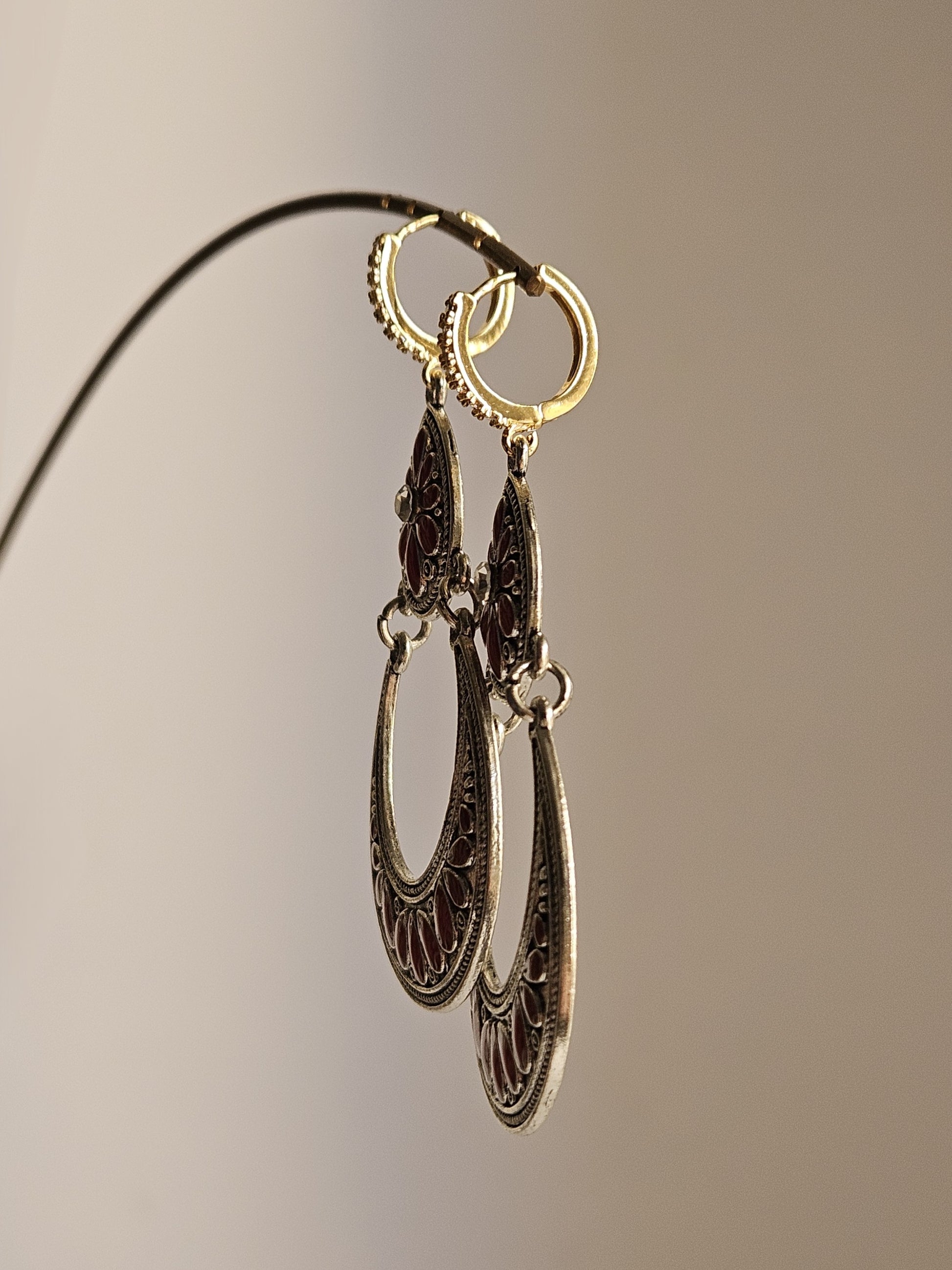 Orecchini con monachelle a cerchietto con strass trasparenti a lobo, caratterizzati da una goccia e un arco in metallo color argento anticato con decori smaltati di colore rosso bordeaux.