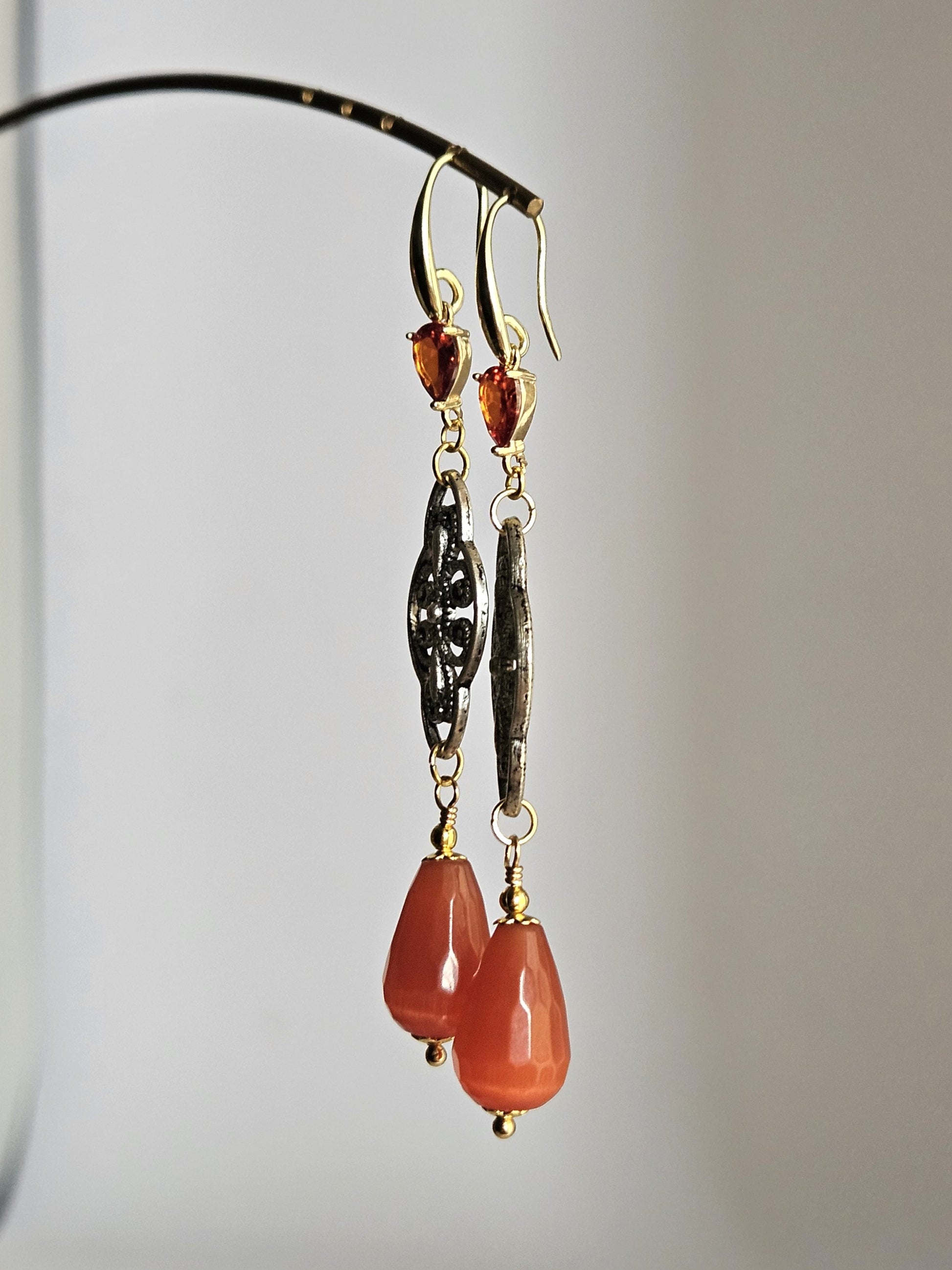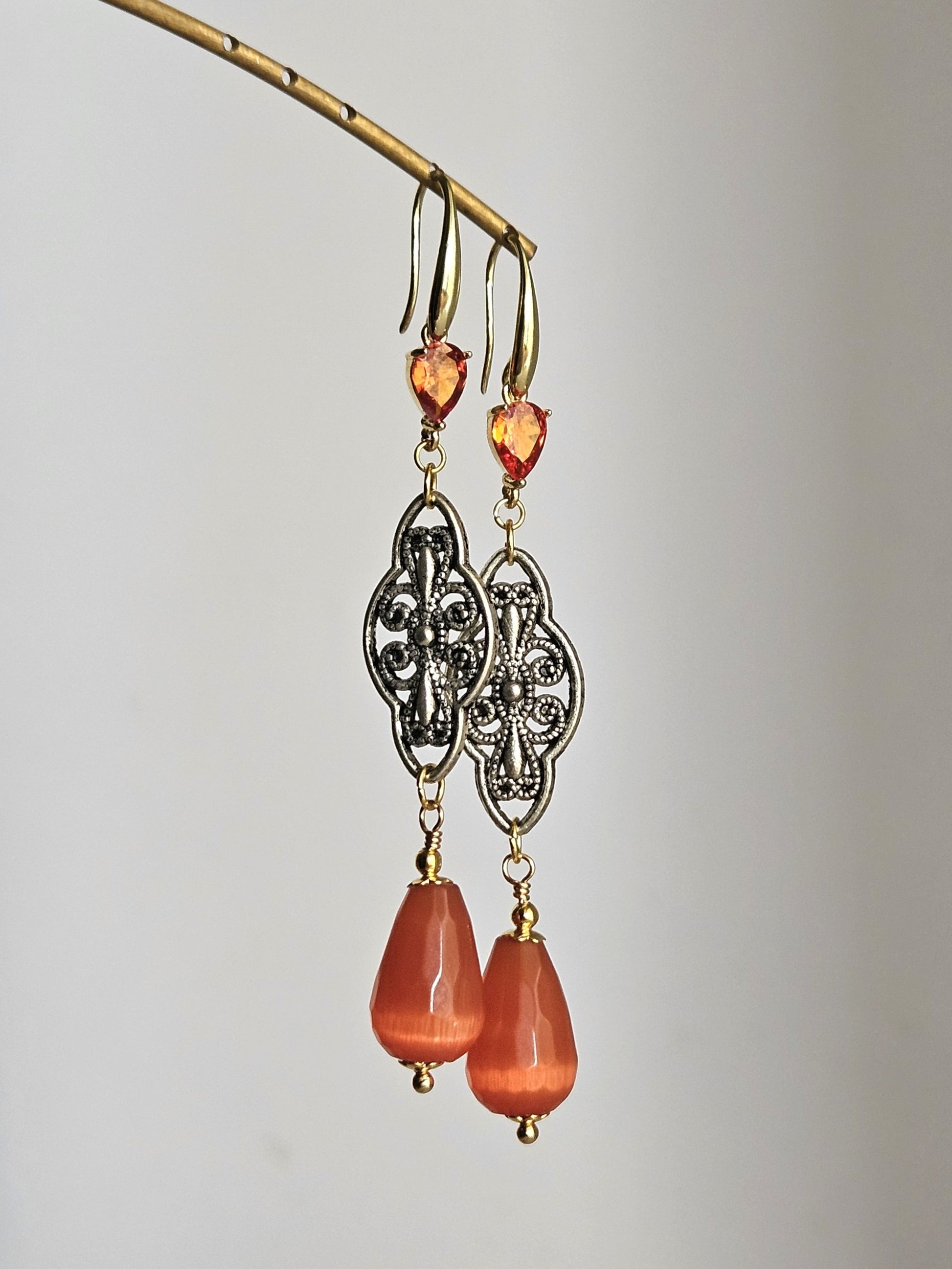 Componenti: strass a goccia di colore mandarino; losanghe dèco in metallo color argento anticato; gocce in agata colore mandarino.