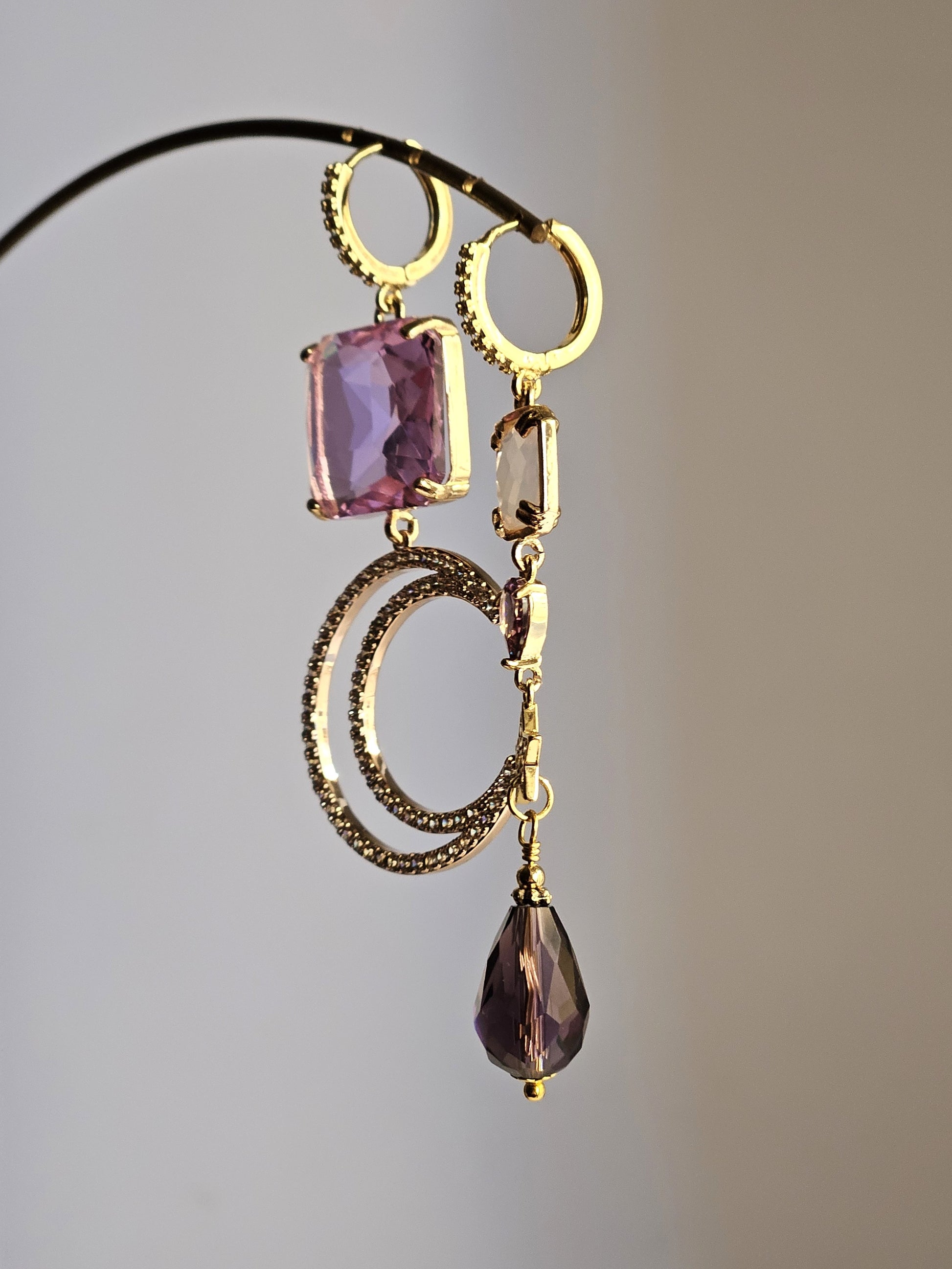 Orecchini con monachelle a cerchietto impreziositi da strass trasparenti, caratterizzati da uno strass quadrato grande colore glicine e uno strass rettangolare ed uno a goccia piccola nei toni del rosa polvere e del violetto accompagnati da una stellina in ottone dorato impreziosita da strass trasparenti. Una luna grande filo anch'essa arricchita da strass ed una goccia in vetro sfaccettato nei toni del viola completano i pendenti.