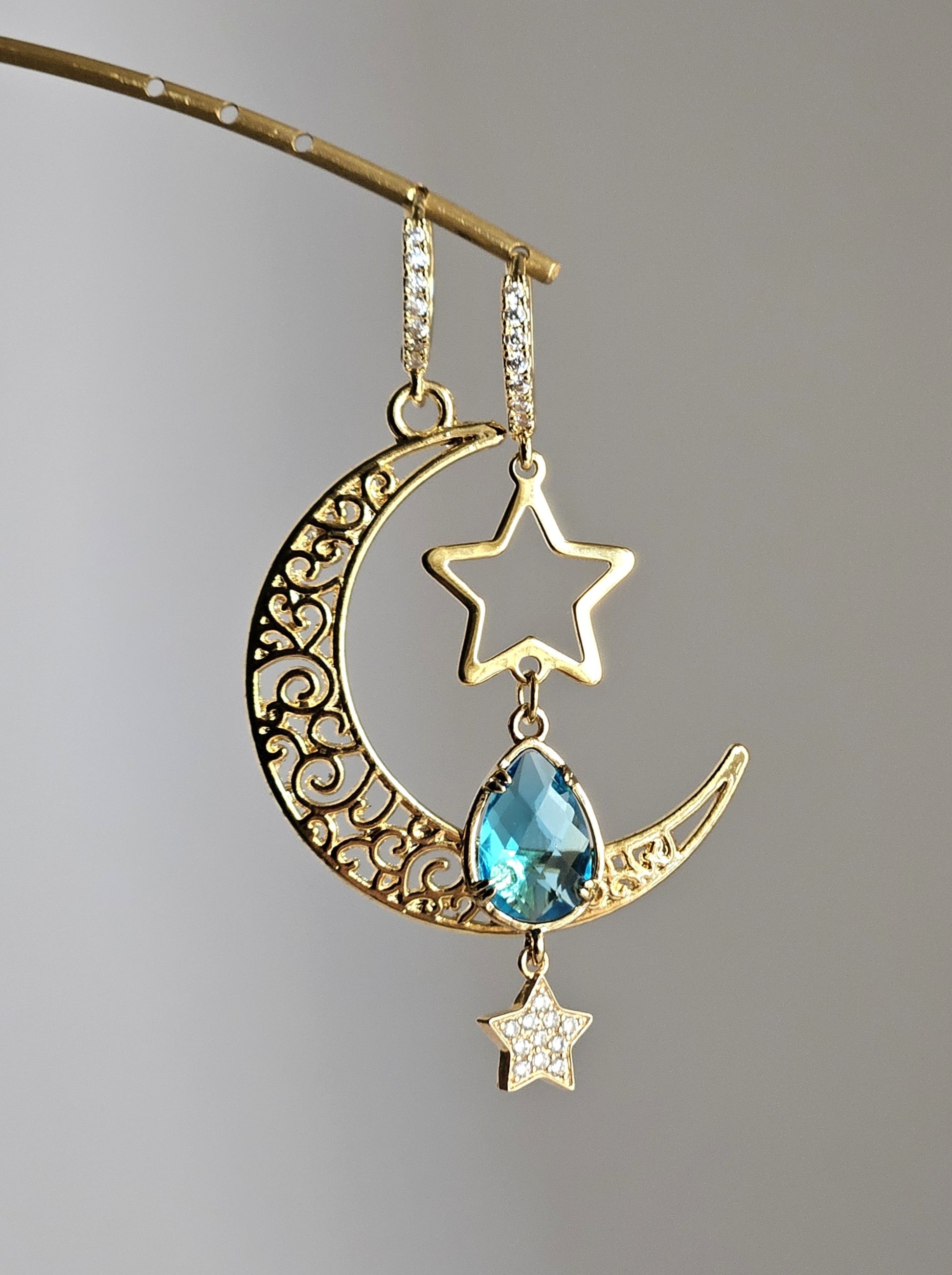 Orecchini a monachella con cerchietti con strass trasparenti, caratterizzati da pendenti asimmetrici: una grande luna in metallo lavorato con effetto ricamo e, sull’altro lato, una stella in filo d’acciaio dorato arricchita da uno strass a goccia turchese e una piccola stellina finale con strass trasparenti.