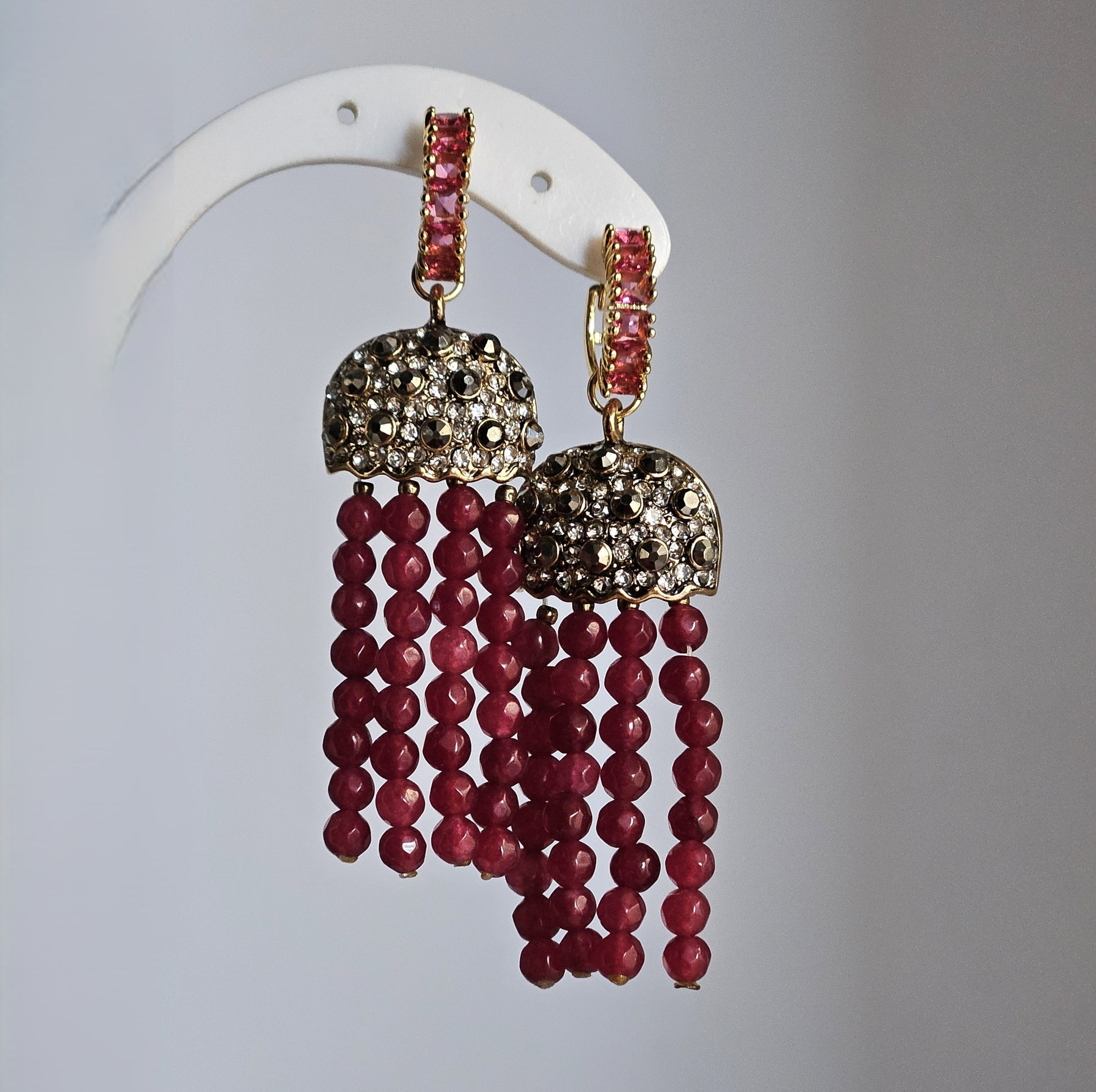 Orecchini con chiusura con monachelle a cerchietto con strass quadrati multi colore con pendenti in metallo di colore argento antico impreziositi da strass grigi e frange in pietra tonda di agata nei toni del vino.