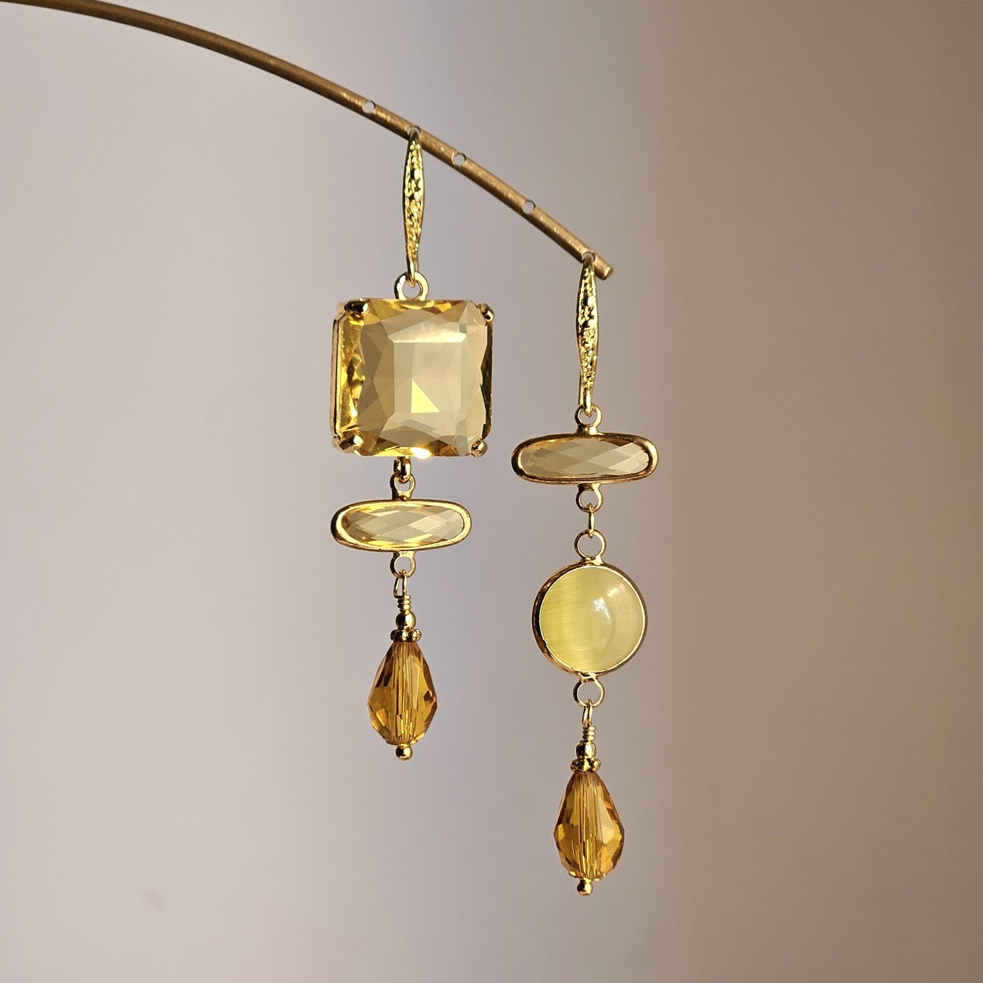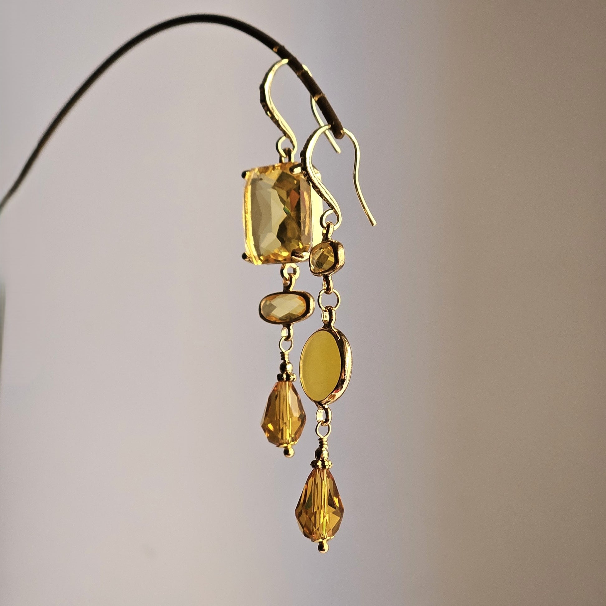 Orecchini con ami lavorati con effetto diamantato in ottone dorato a lobo, composti da una coppia di strass a losanghina, uno strass quadrato grande e uno tondo, tutti nei toni del vaniglia, con due gocce in vetro sfaccettato nei toni del miele a completare i pendenti.