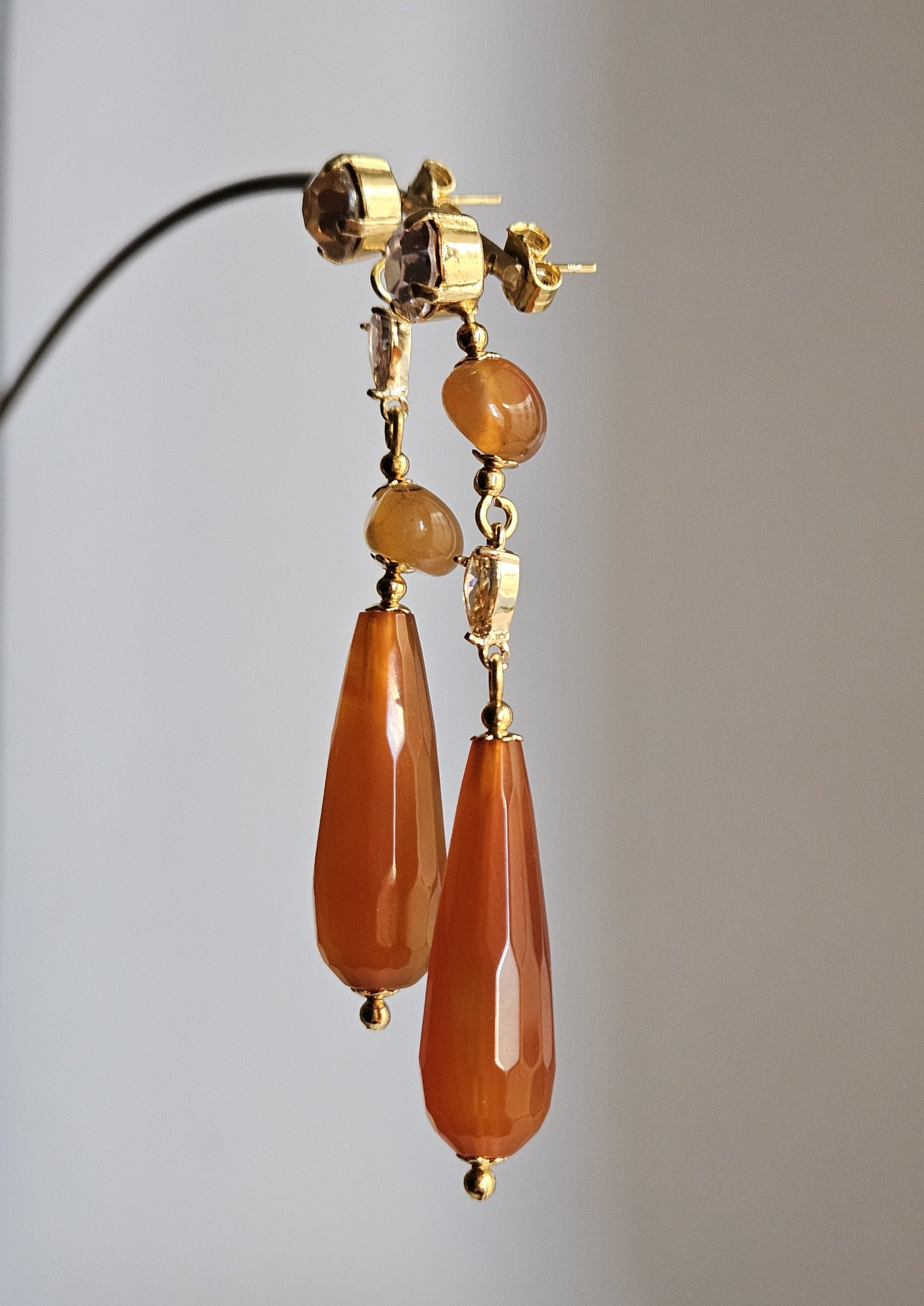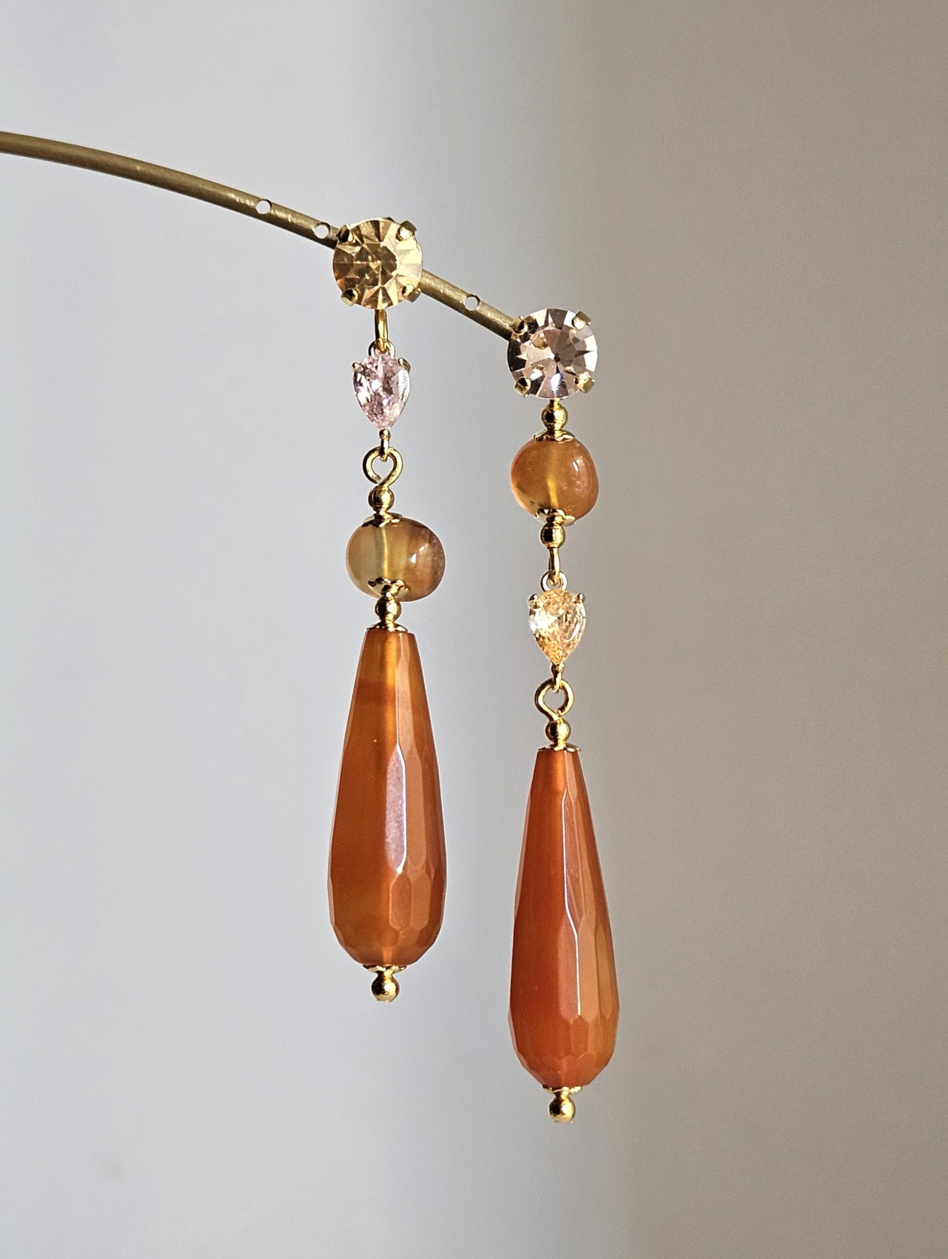 Orecchini punto luce con perno, in ottone dorato con strass tondi nei colori giallo oro e rosa peonia, composti da due strass a goccia piccola nelle stesse sfumature di colore accompagnati da due pietre dalla forma irregolare in agata di colore ambra. Completano il design due gocce in agata nei toni del miele.