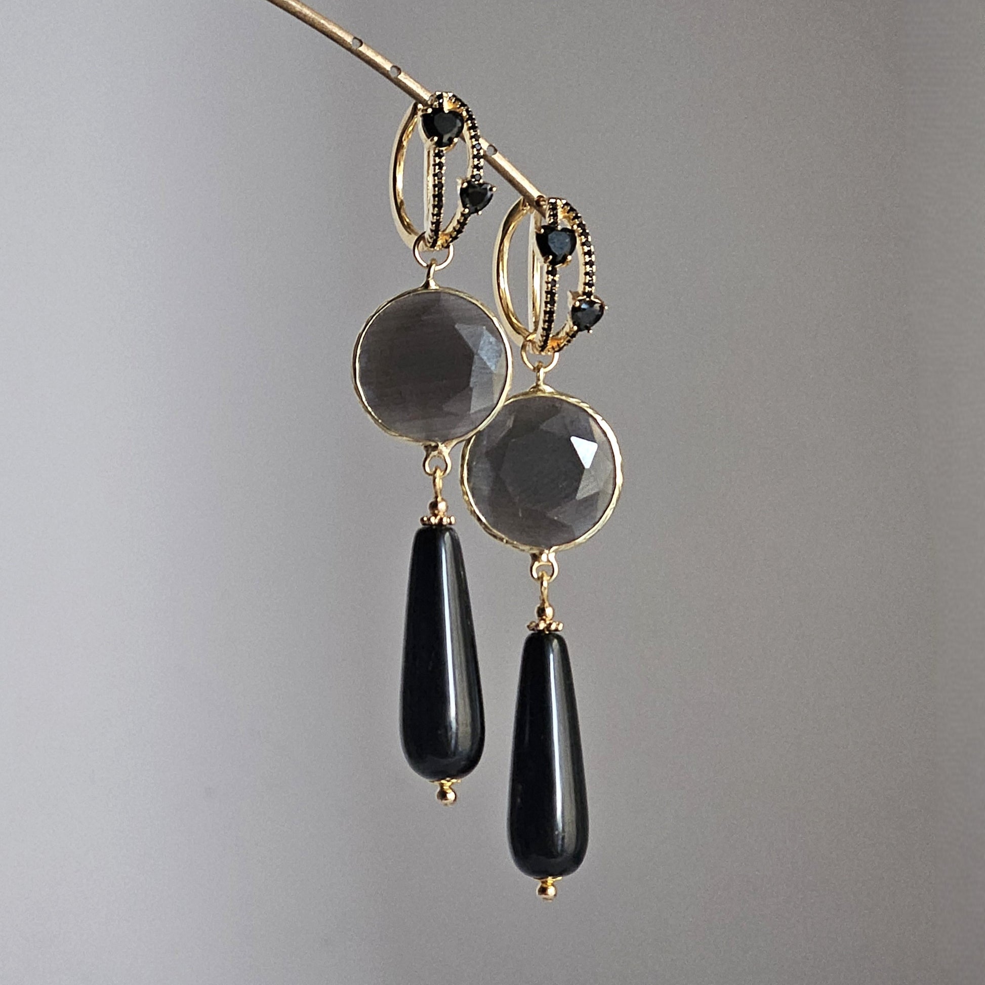 Orecchini con monacelle fantasia a cerchio con strass a cuore di colore nero, composti da due inserti tondi in pietra sfaccettata nei toni del grigio fumo e da due gocce lunghe in agata di colore nero finali.