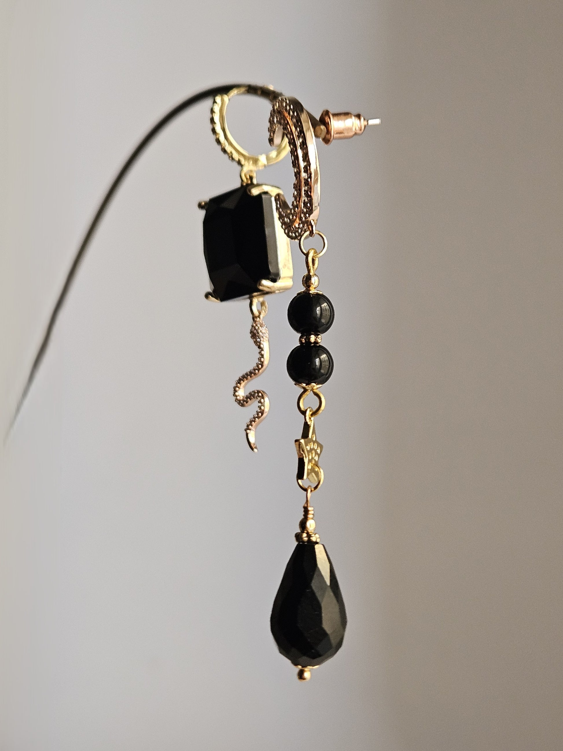 Componenti: strass quadrato colore nero; pietre tonde in agata nera; stellina e snake in ottone dorato con strass trasparenti; goccia in vetro sfaccettato colore nero.