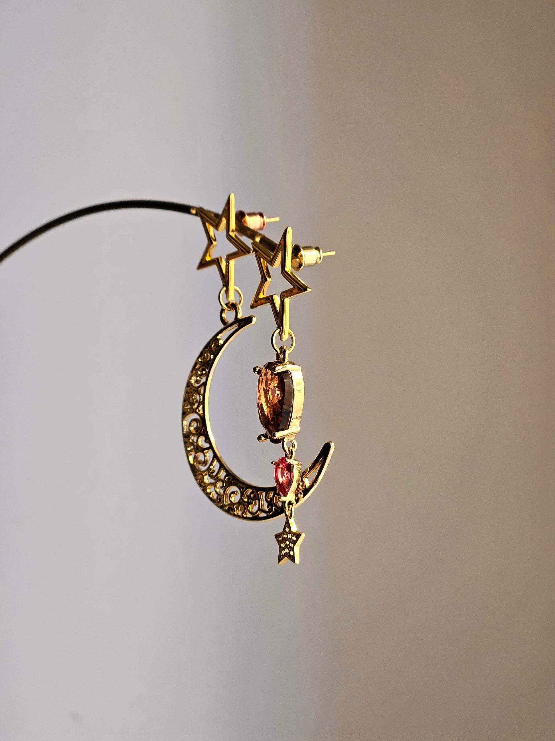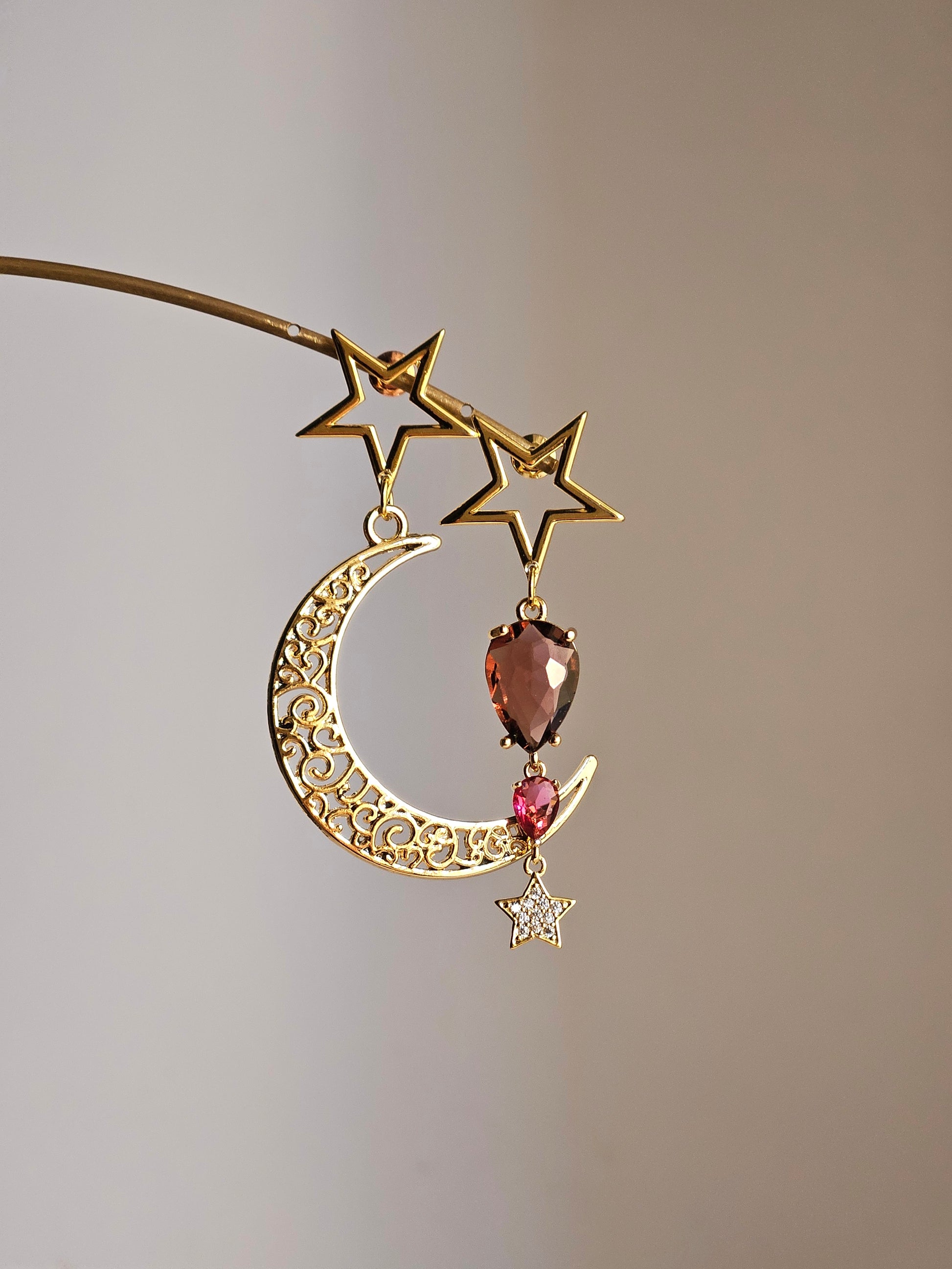 Orecchini a perno con stelle filo in ottone dorato a lobo, maniglie da due strass a goccia in due misure nei colori vino e amaranto. Una luna grande ricamata in metallo dorato ed una stellina in ottone dorato arricchita con strass trasparenti completano i pendenti.