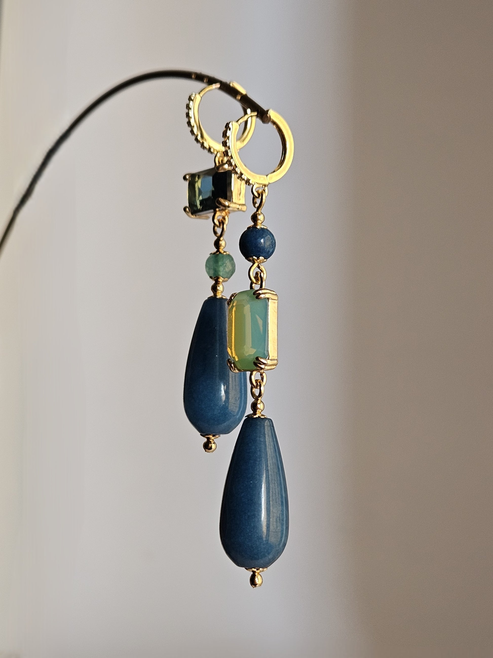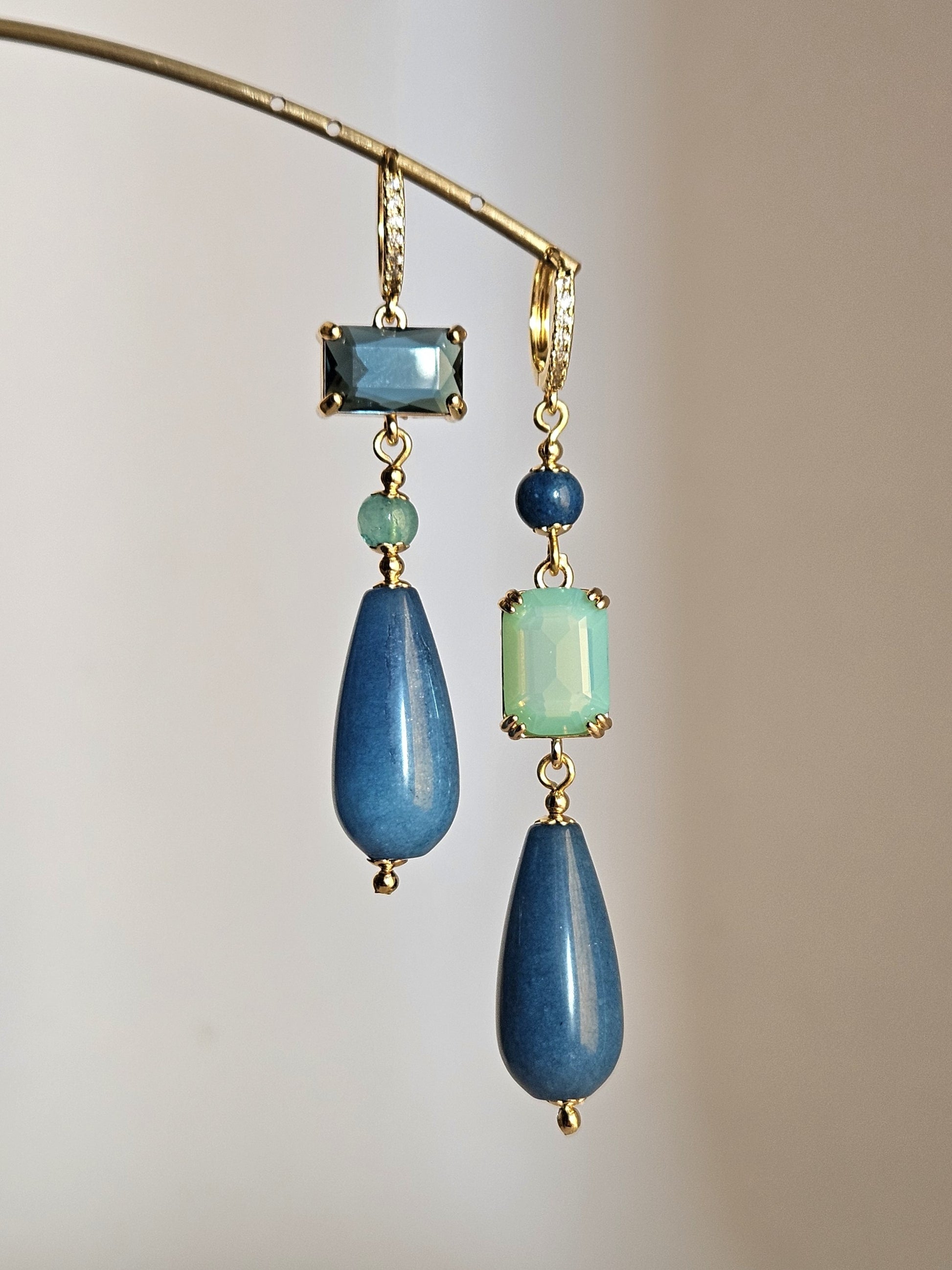 Componenti: strass rettangolare di colore blu ottanio; strass rettangolare di colore verde acqua; pietre tonde in agata nei colori verde acqua e blu ottanio; gocce finali in agata di colore blu ottanio.