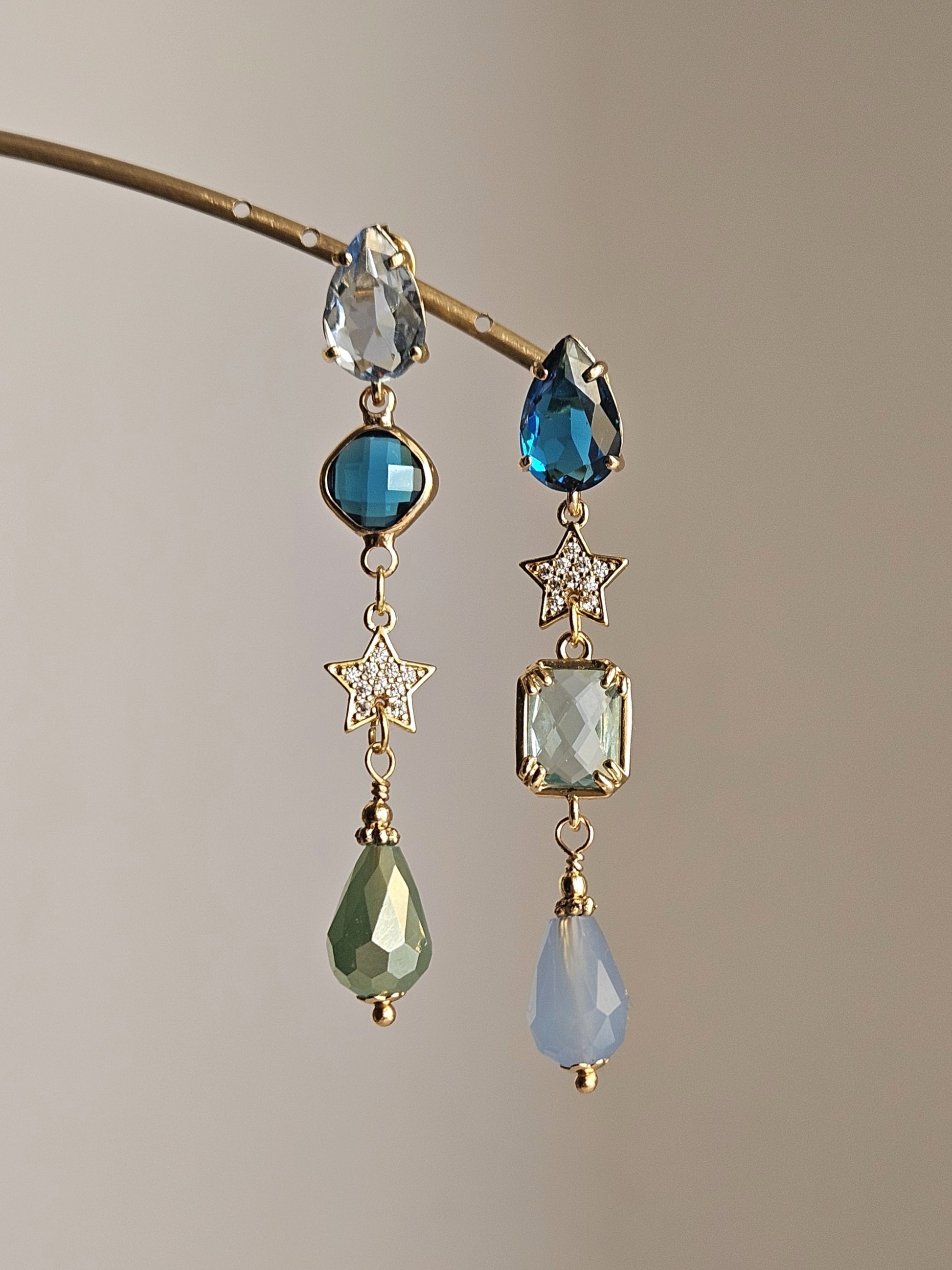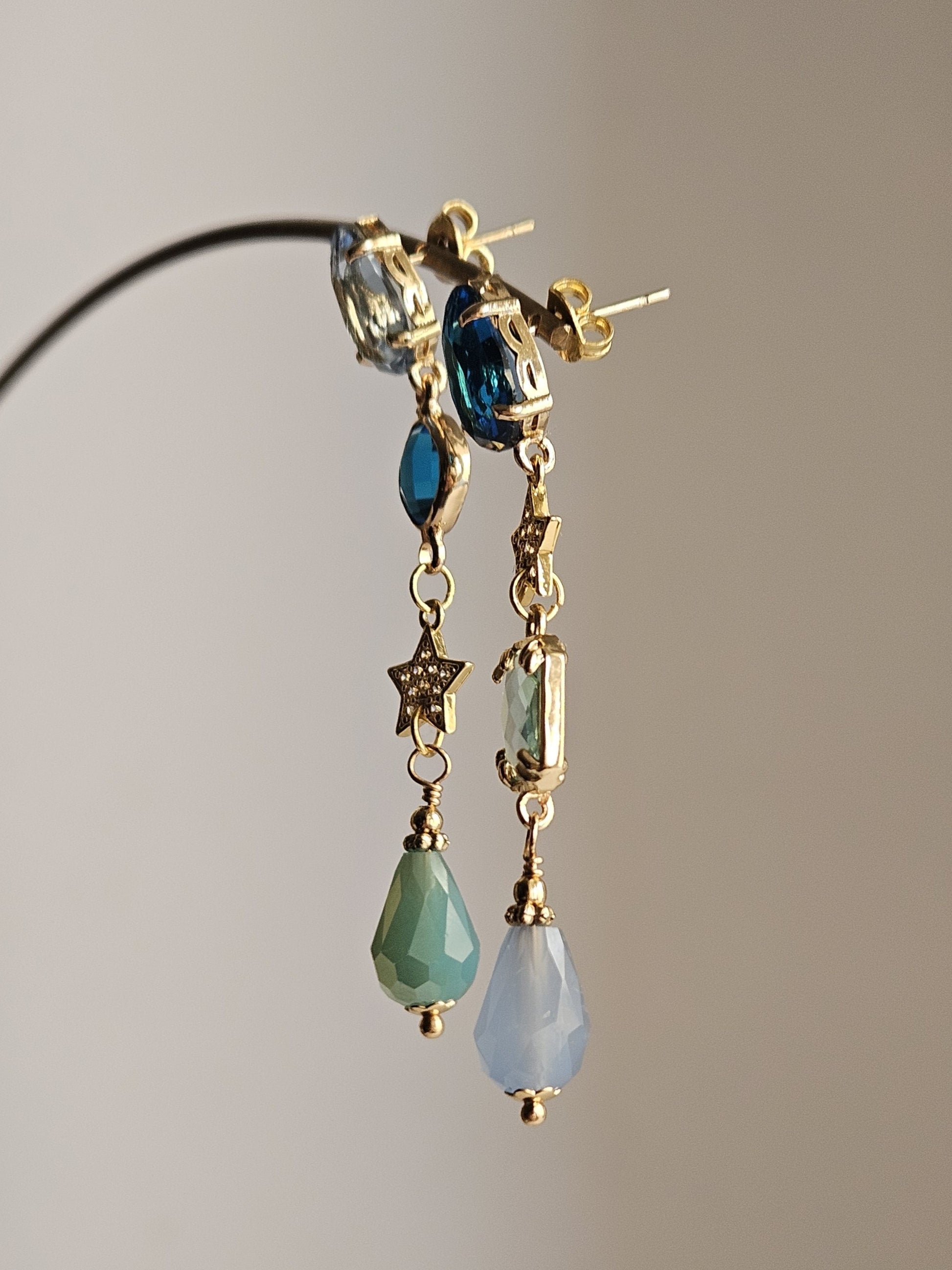 Orecchini perno con strass a goccia a lobo nei colori ottanio e azzurro, caratterizzati da due strass intermedi, uno rettangolare di colore azzurro ed uno tondo di colore ottanio, alternati con due stelline in ottone dorato impreziosite da strass trasparenti. Completano i pendenti due gocce in vetro sfaccettato nei toni dell'azzurro e del verde acqua.