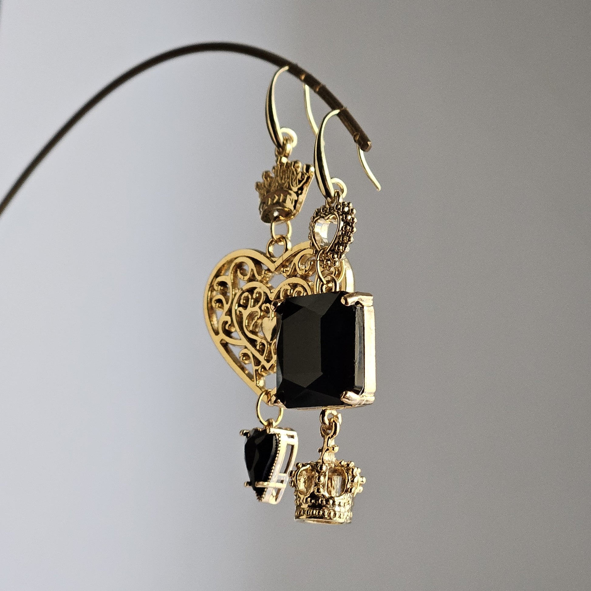 Orecchini con ami a goccia in ottone dorato a lobo, composti da un cuore grande traforato, una corona e un cuore piccolo, tutti in metallo dorato, accompagnati da uno strass quadrato grande di colore nero. A completare i pendenti una corona in metallo dorato ed un cuore con strass nero.