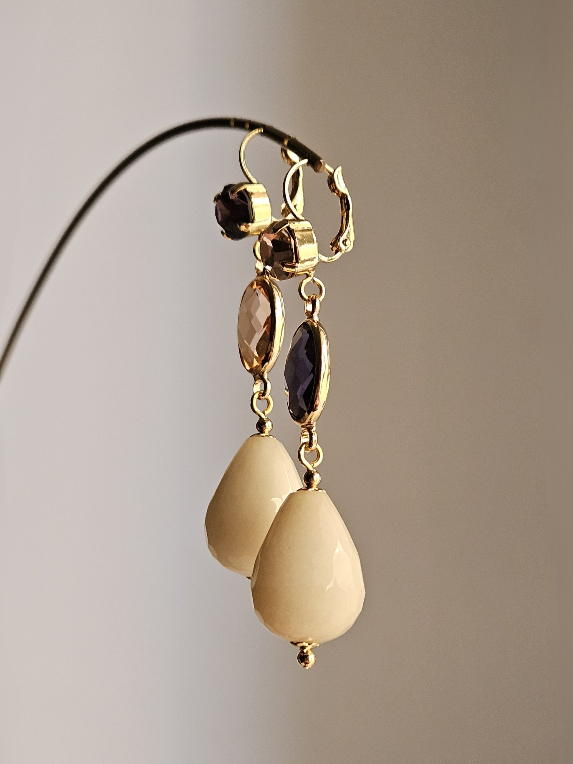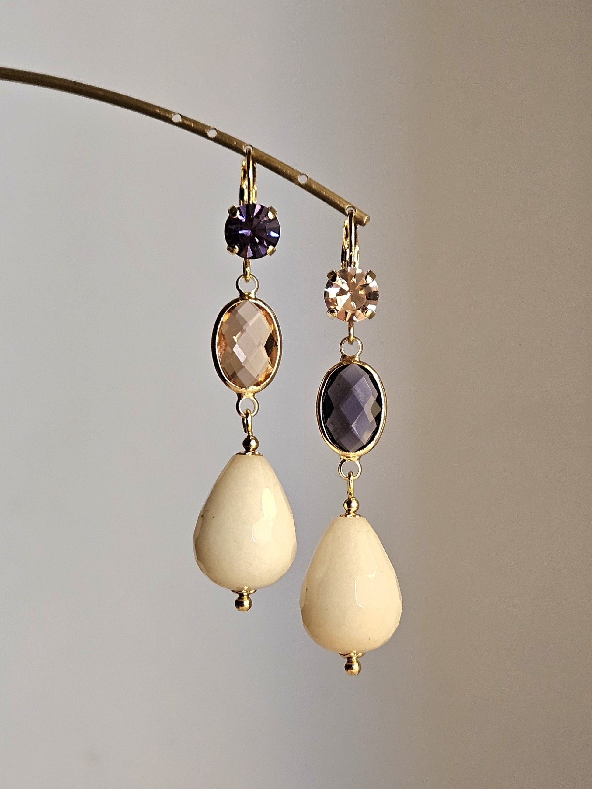 Orecchini con monachelle a scatto con strass tondi nei colori viola e rosa, composti da strass ovali nei colori viola e rosa antico, accompagnati da due gocce in agata nei toni del rosa pallido a completare i pendenti.