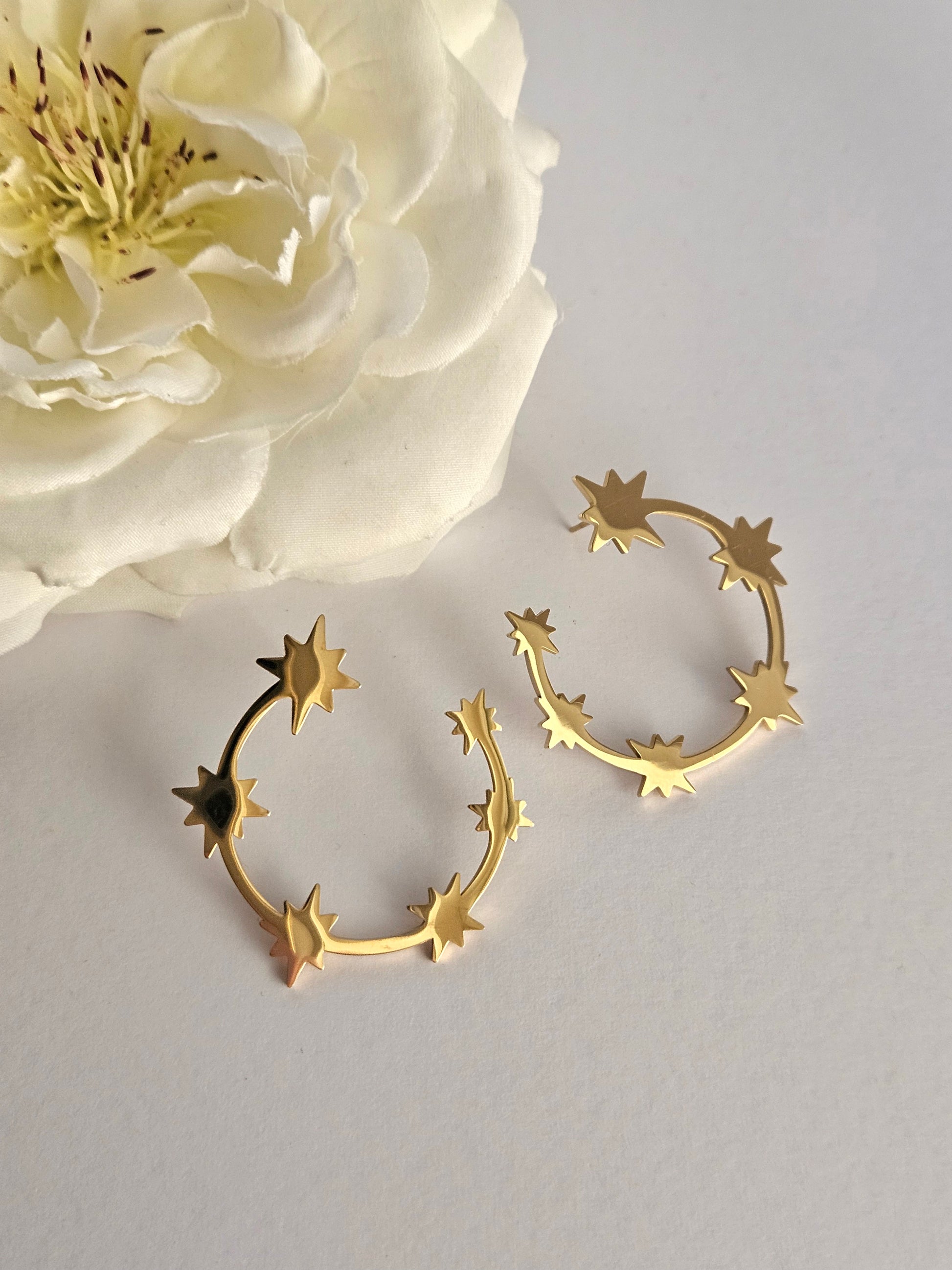 Orecchini perno a lobo in acciaio dorato caratterizzati da cerchi con sei scintille.
