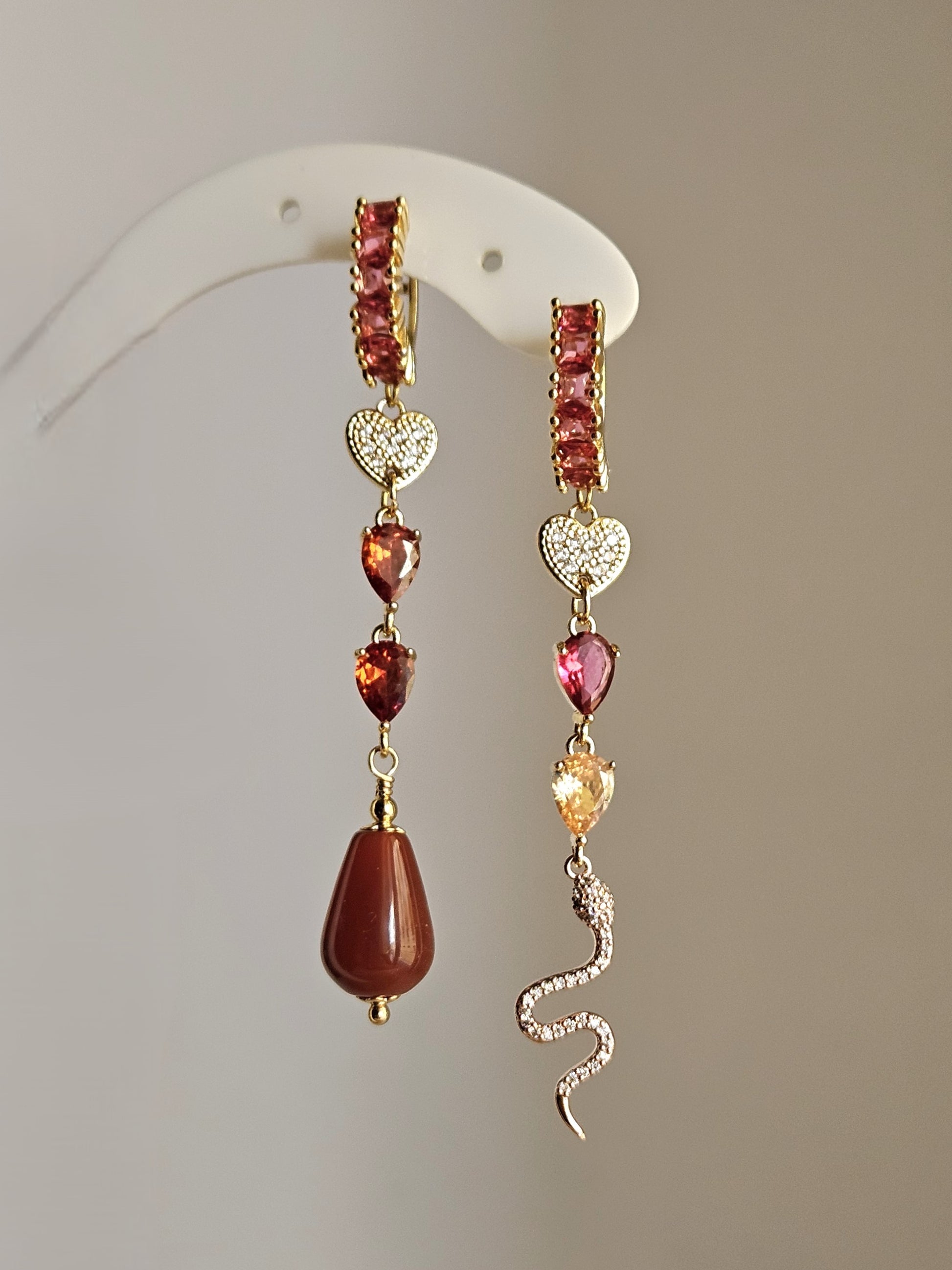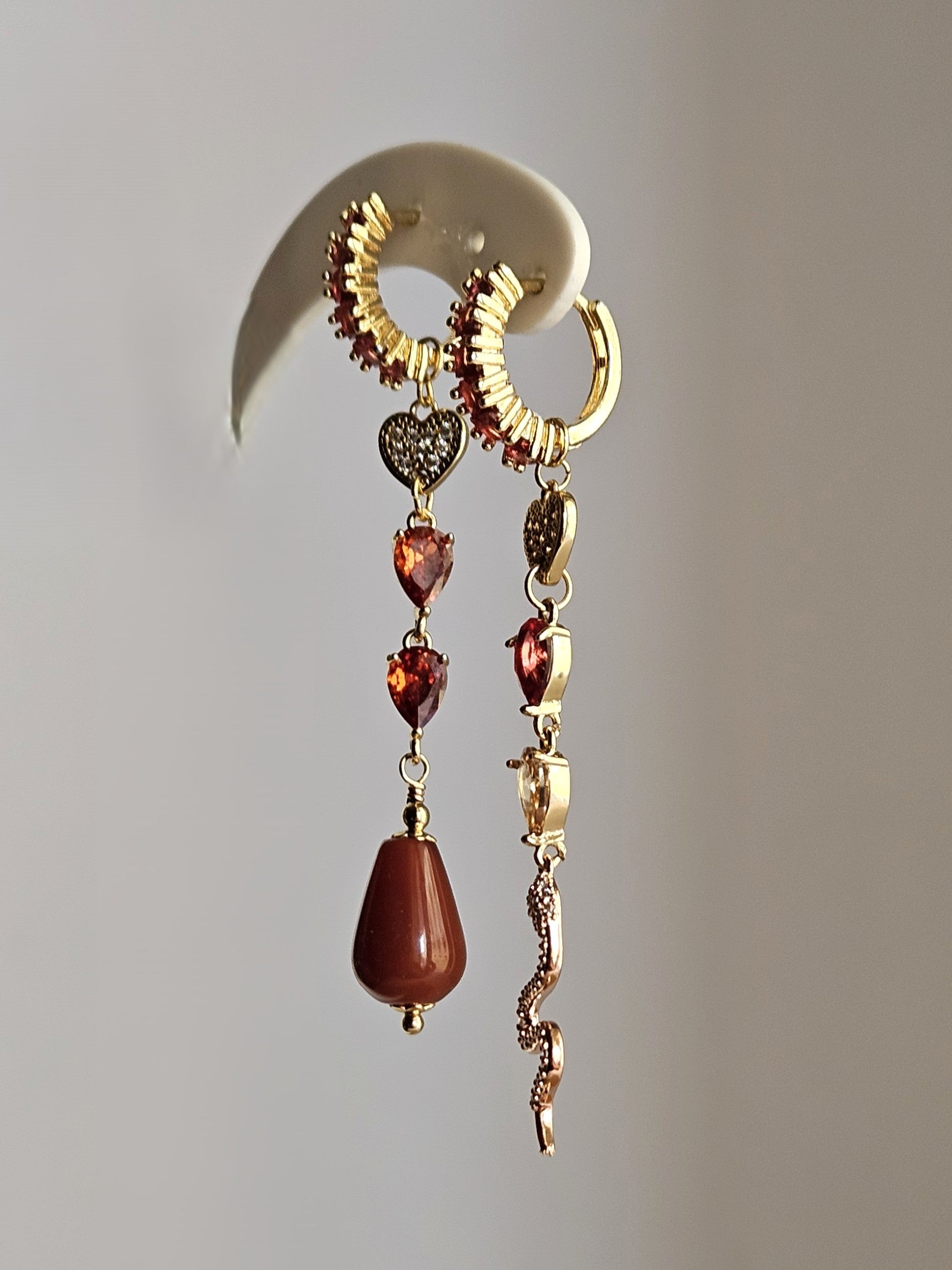 Componenti: strass a goccia nei toni caramello, amaranto e vaniglia; cuoricini in ottone dorato impreziositi da strass trasparenti; goccia in agata nei toni del caffè; snake in ottone dorato arricchito da strass trasparenti.