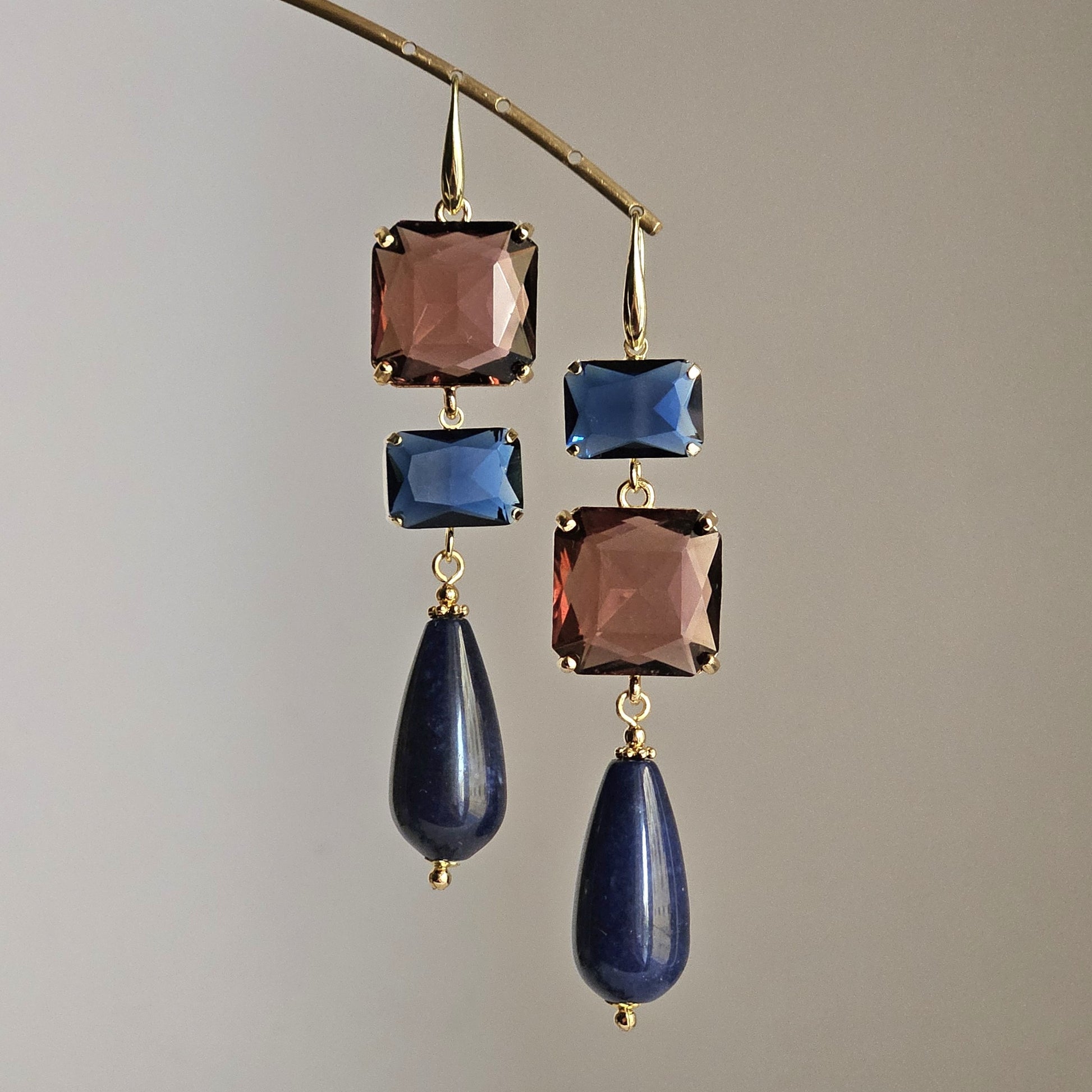 Orecchini con ami a goccia in ottone dorato a lobo, caratterizzati da una coppia di strass quadrati di colore rosso vino alternati con due strass rettangolari nei toni del blu intenso. Due gocce in agata di colore blu completano i pendenti.