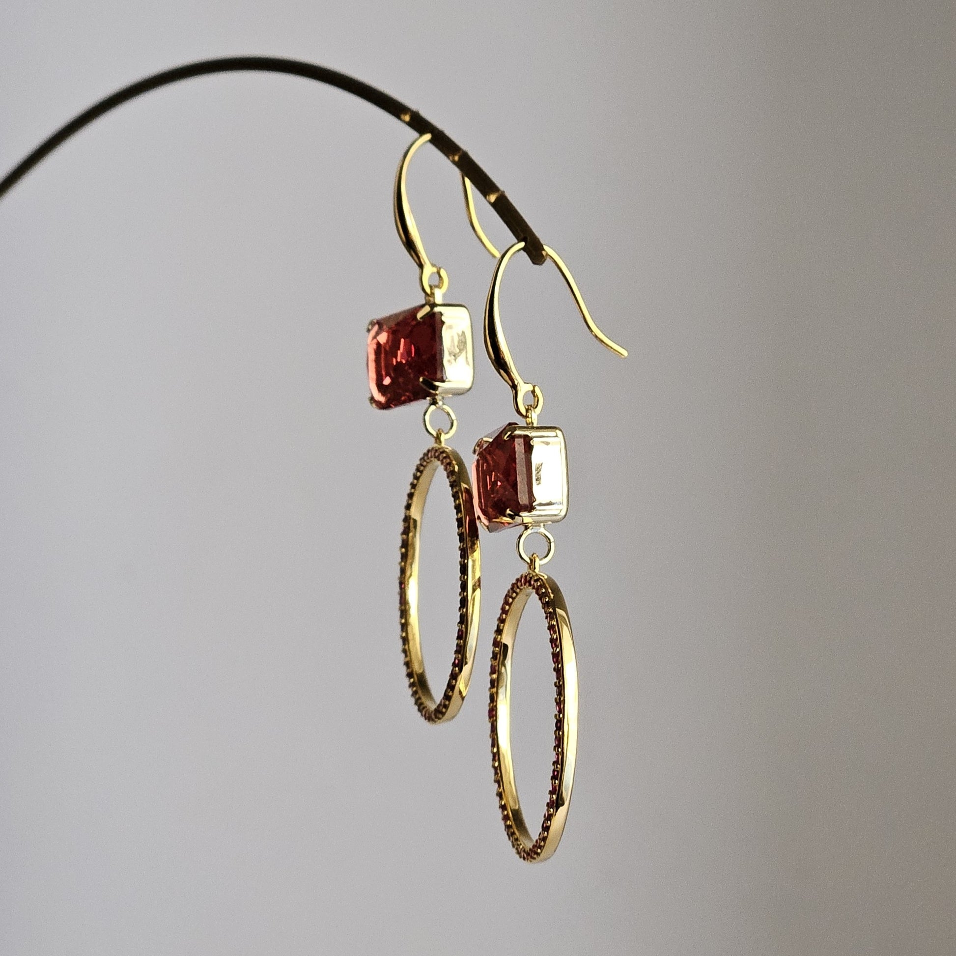 Orecchini con ami a goccia in acciaio dorato a lobo, caratterizzati da due strass rettangolari di colore rosso rubino accompagnati da due pendenti a cerchio impreziositi da strass dello sesso tono.