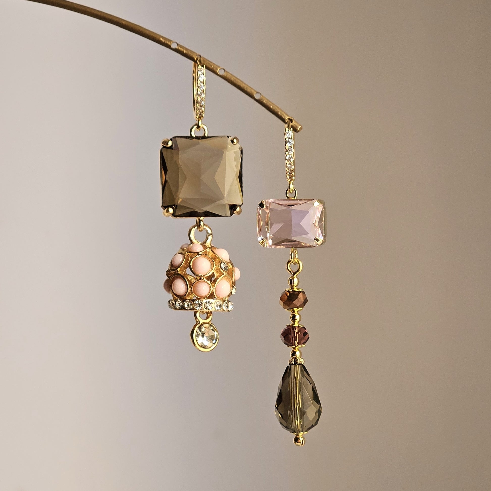 Orecchini con monachelle a cerchietto impreziositi da strass trasparenti, caratterizzati da due strass nei colori fango e rosa peonia, una campana in metallo dorato arricchita da pietre tonde di colore rosa e una goccia con due pietre tonde in vetro sfaccettato nei toni del fango, bronzo e vino completano i pendenti.
