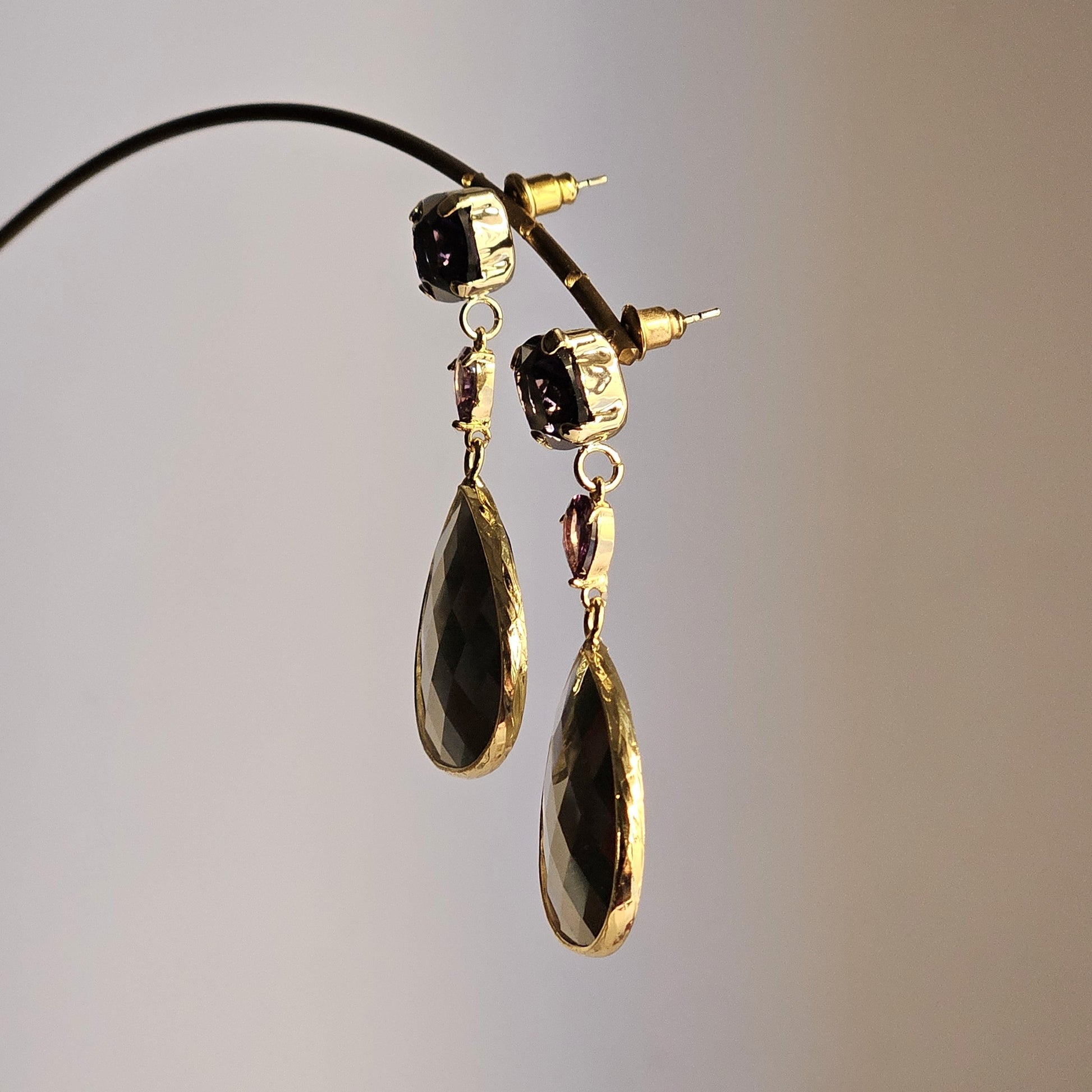 Orecchini punto luce con perno, in ottone dorato con strass quadrati, accompagnati da due piccole gocce strass, tutti nei toni del viola. Completano il design due gocce in pietra sfaccettata di color visone.