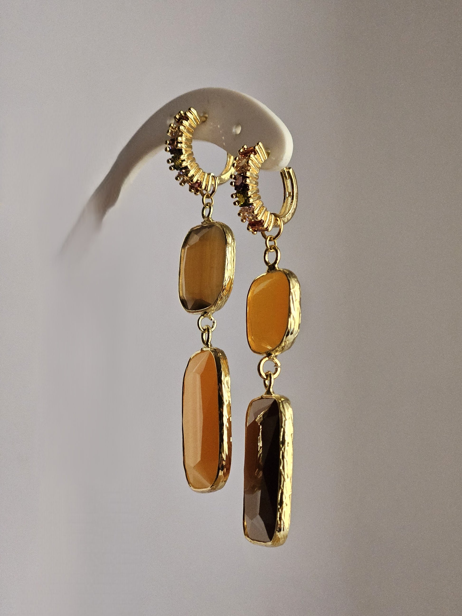 Orecchini con monachelle a cerchietto con strass multi-color a lobo, con inserti intermedi quadrati in pietra sfaccettata nei colori tangerine e marron glacé, accompagnati da due pendenti rettangolari finali negli stessi colori, alternati.