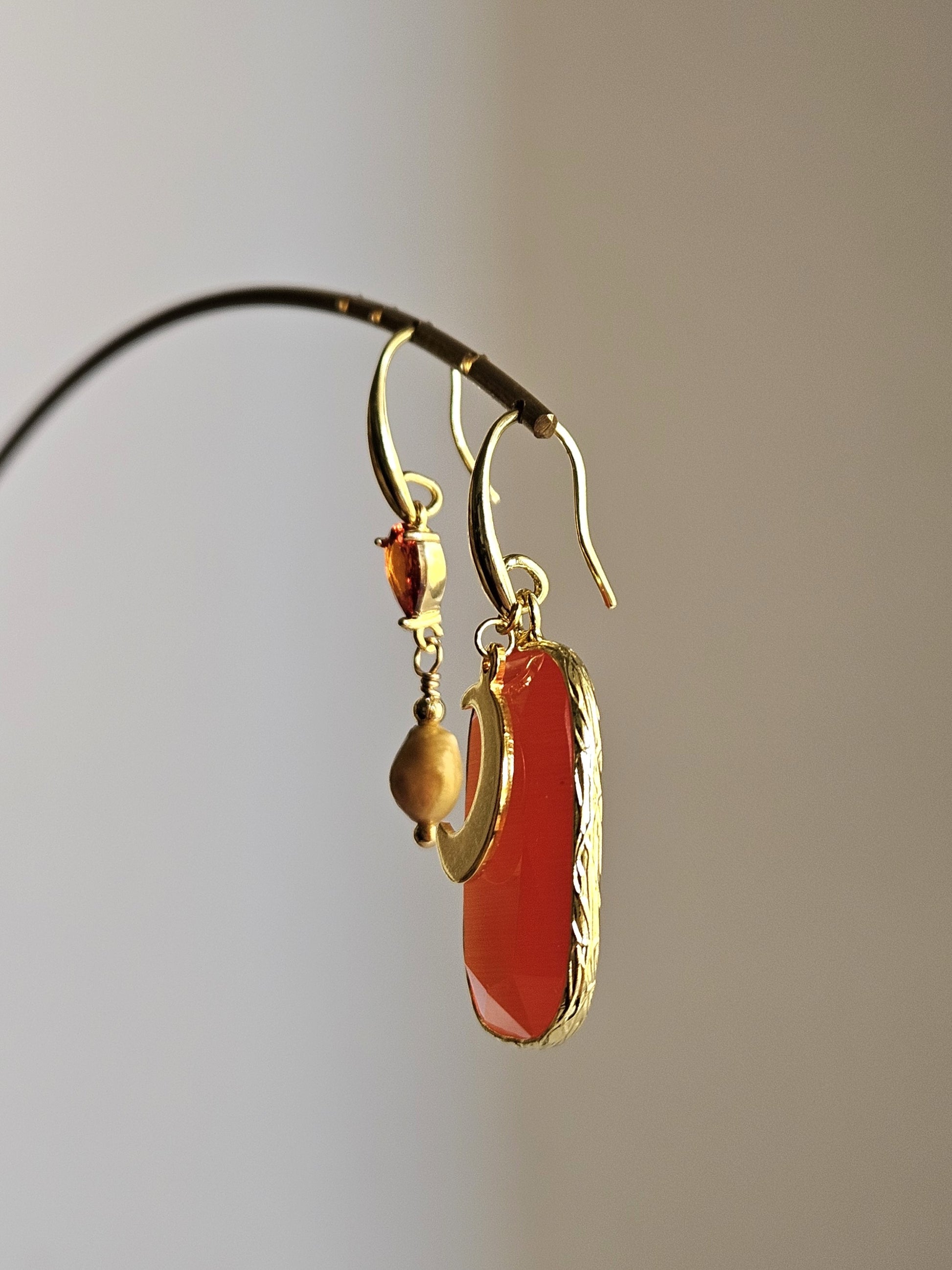 Componenti: strass a goccia di colore arancio; pendente rettangolare in pietra sfaccettata nei toni del mandarino; luna un acciaio dorato; perla scaramazza a goccia.