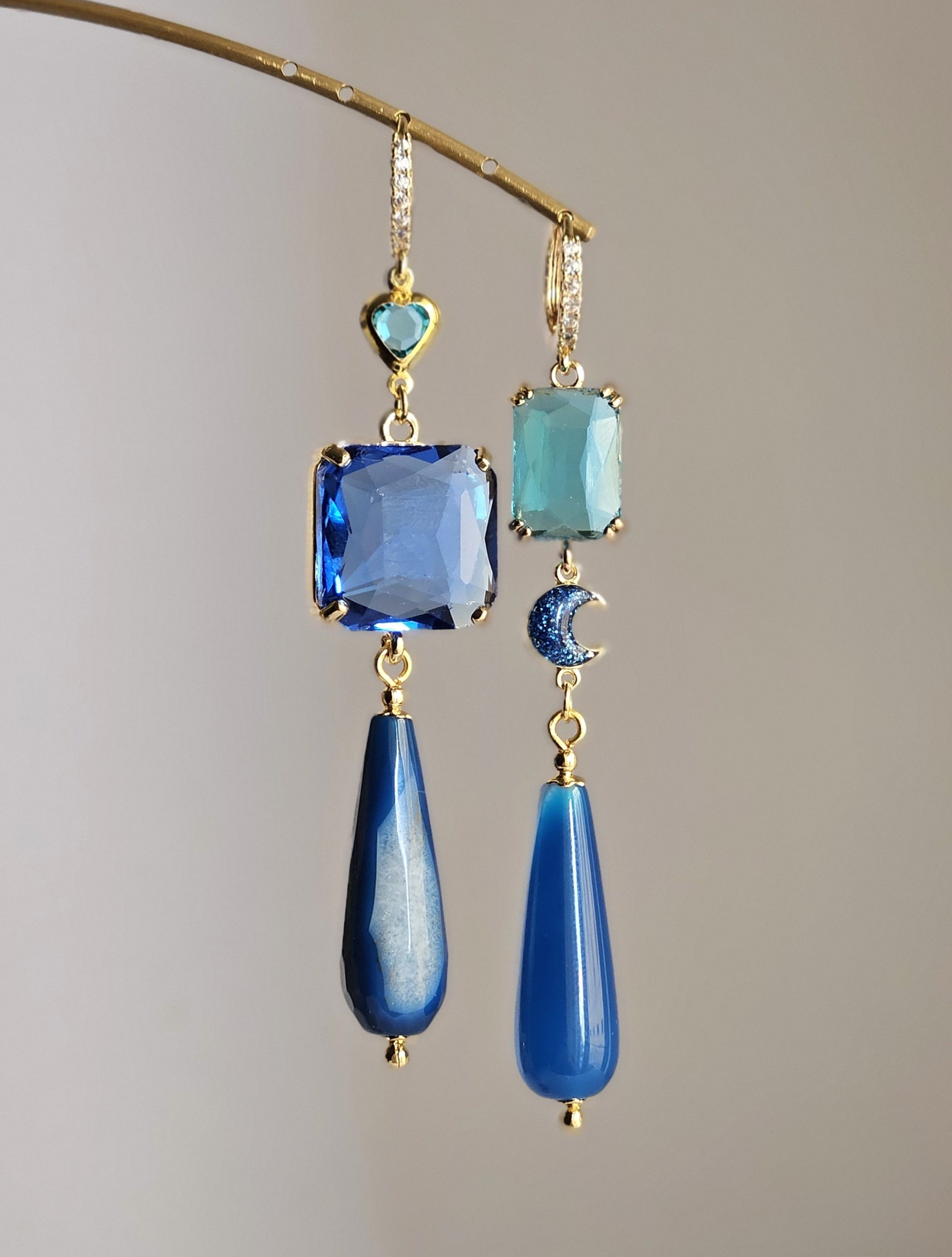 Orecchini con monachella a cerchietto, impreziositi da strass trasparenti a lobo. Caratterizzati da inserti composti da grandi strass nei toni del blu cielo e turchese, arricchiti da una lunetta glitterata blu e un cuore decorato con strass turchese. I pendenti si completano con due eleganti gocce di agata blu variegata.