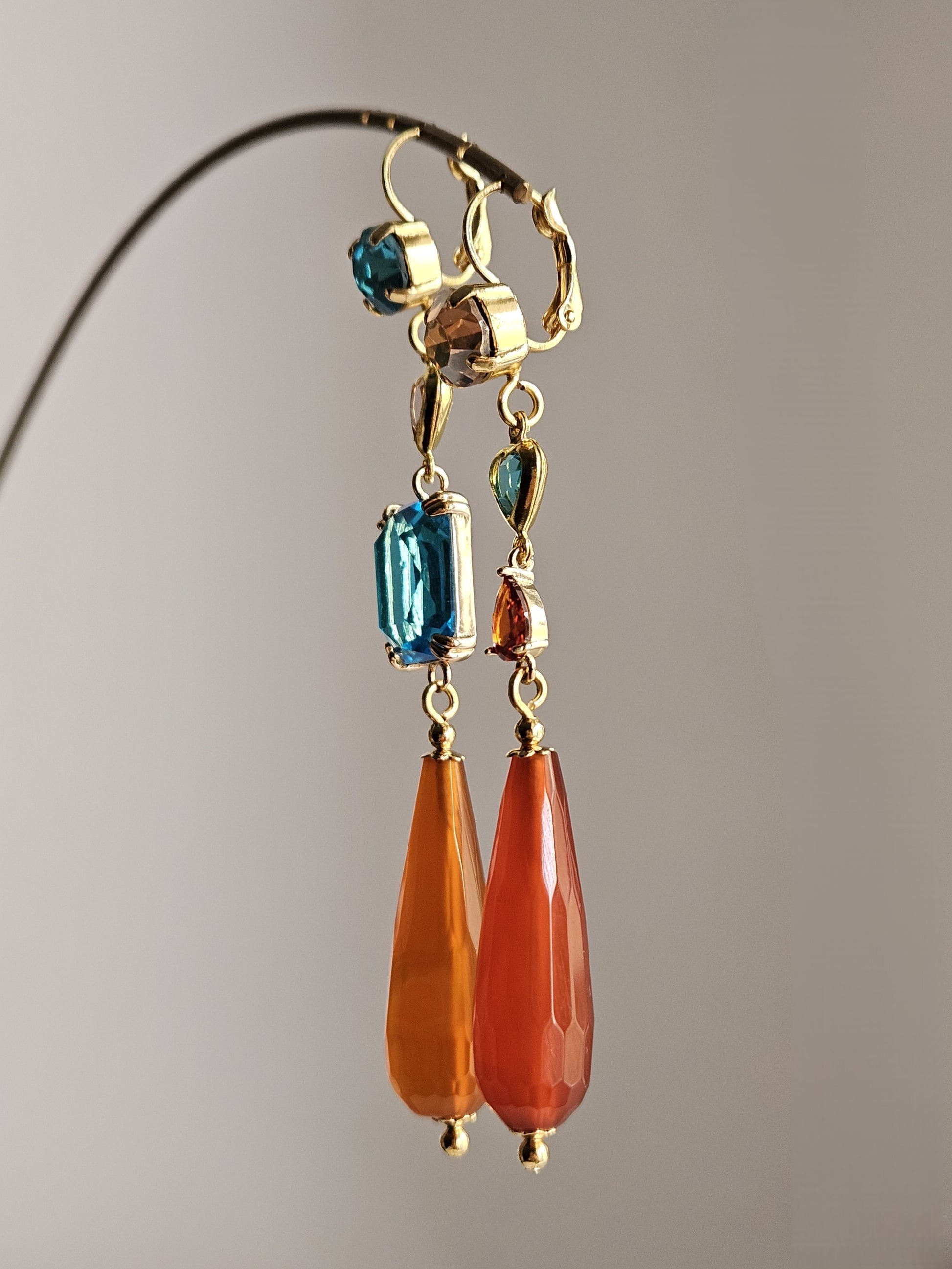 Orecchini con monachelle a scatto con strass tondi nei colori turchese e oro, composti da due strass a cuore nei toni turchese e viola, accompagnati da uno strass rettangolare di colore turchese ed uno a goccia piccola di colore caramello. Due gocce in agata nei toni del miele completano i pendenti.
