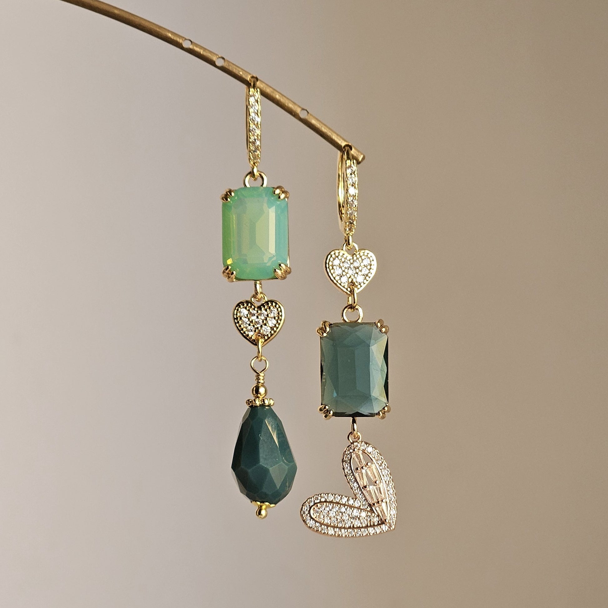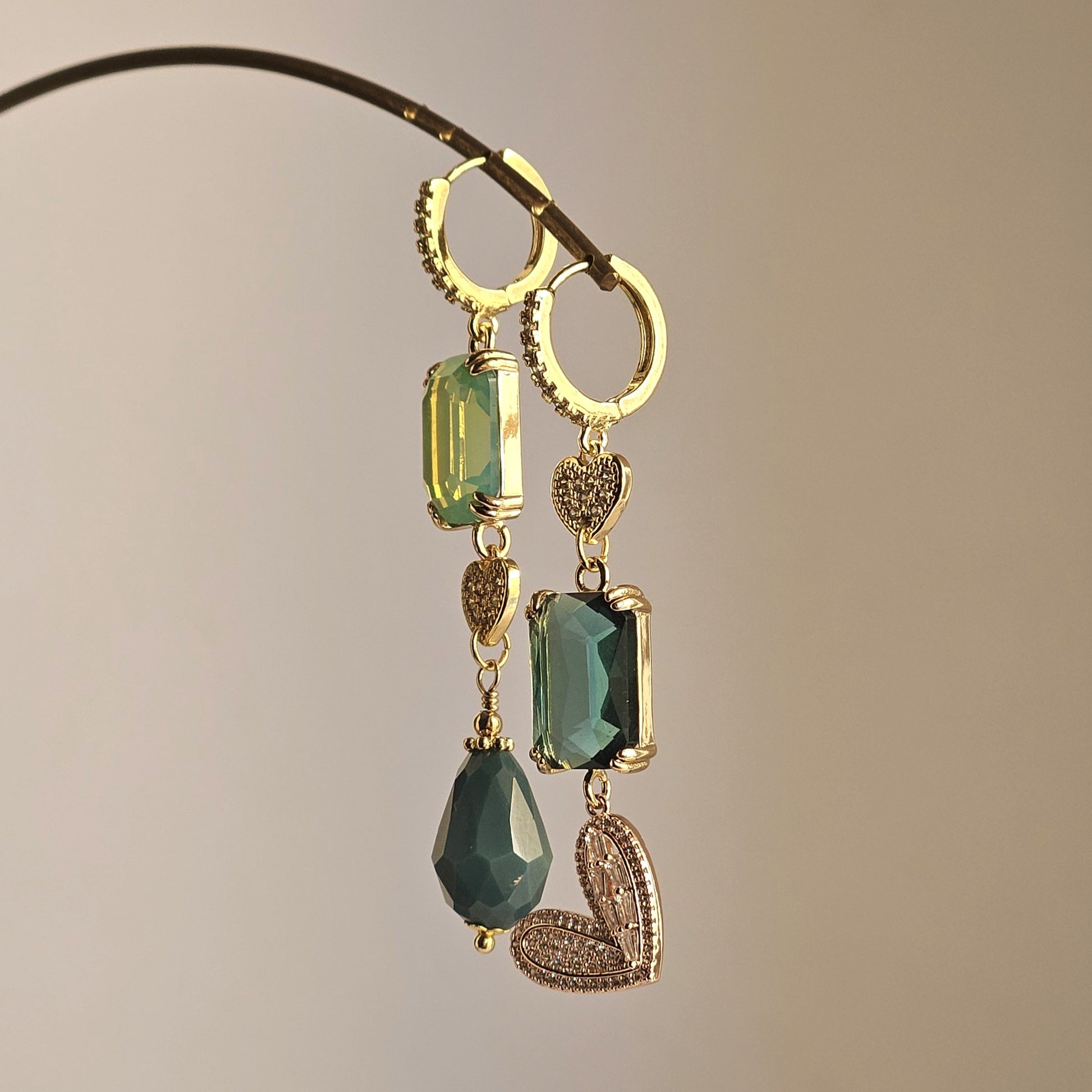 Orecchini con monachelle a cerchietto con strass trasparenti a lobo, composti da due strass rettangolari nei colori verde mare e ottanio, accompagnati da due cuoricini in ottone dorato con strass. Completano il design una goccia in vetro sfaccettato di colore ottanio ed un cuore in ottone dorato impreziosito da strass trasparenti.