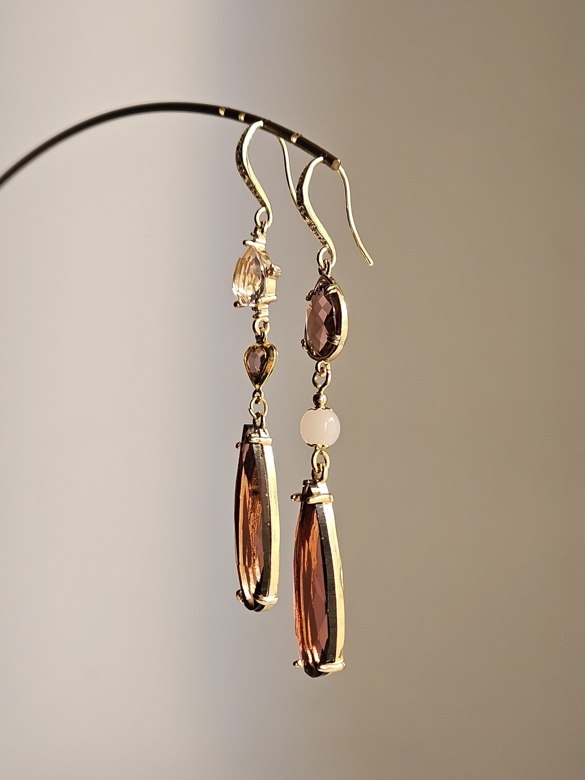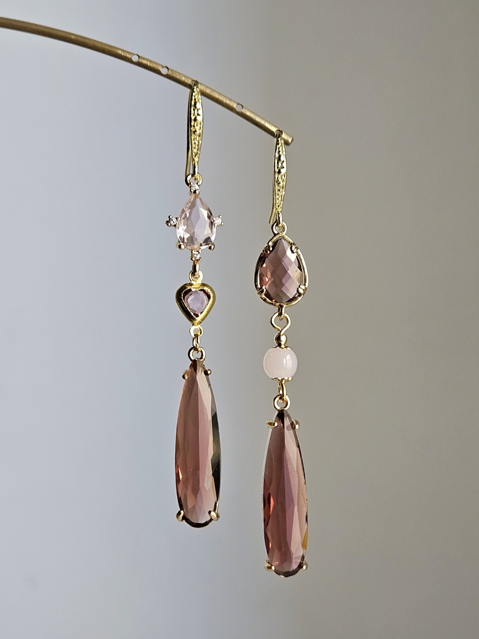 Componenti: coppia di strass a goccia nei colori rosa peonia e vino; strass a cuore di colore vino; pietra tonda in agata rosa; coppia di strass a goccia lunga di colore vino.
