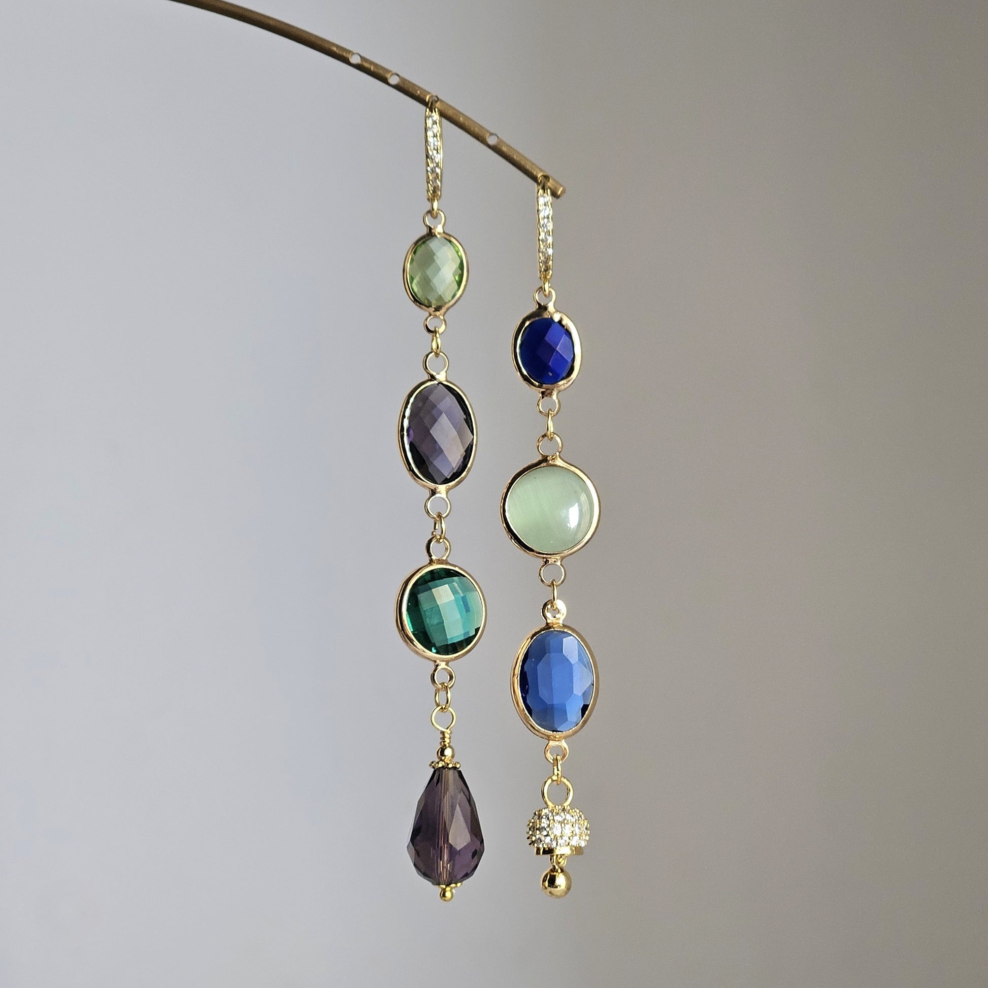Orecchini con monachelle a cerchietto impreziositi da strass trasparenti a lobo, composti da strass tondi e ovali nei colori blu viola e verde, accompagnati da una goccia in vetro sfaccettato di colore viola e una campanella in ottone dorato con strass trasparenti a completare i pendenti.