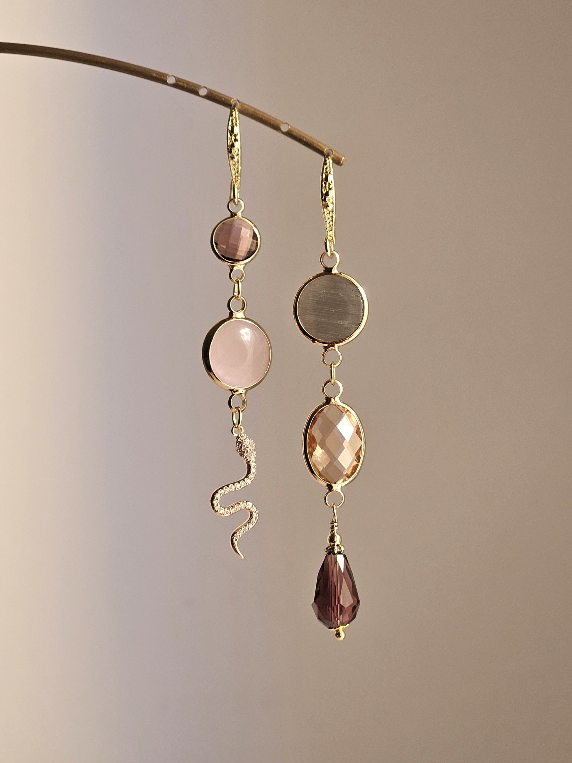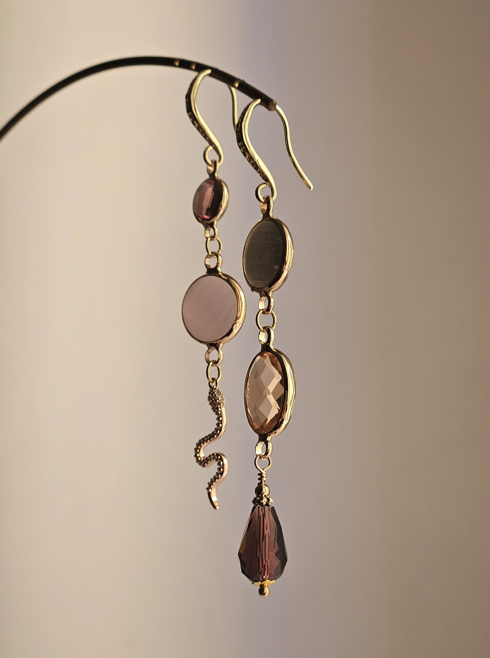 Orecchini con ami lavorati con effetto diamantato in ottone dorato a lobo, composti da strass tondi e ovali declinati in nuances tra il rosa, vino e grigio. Uno snake in ottone dorato impreziosito da strass trasparenti e una goccia in vetro sfaccettato di colore viola completano i pendenti.