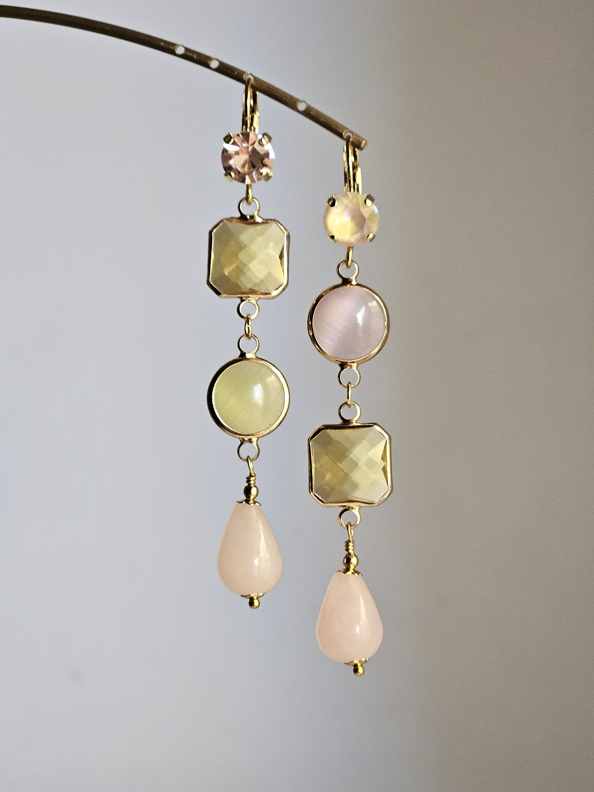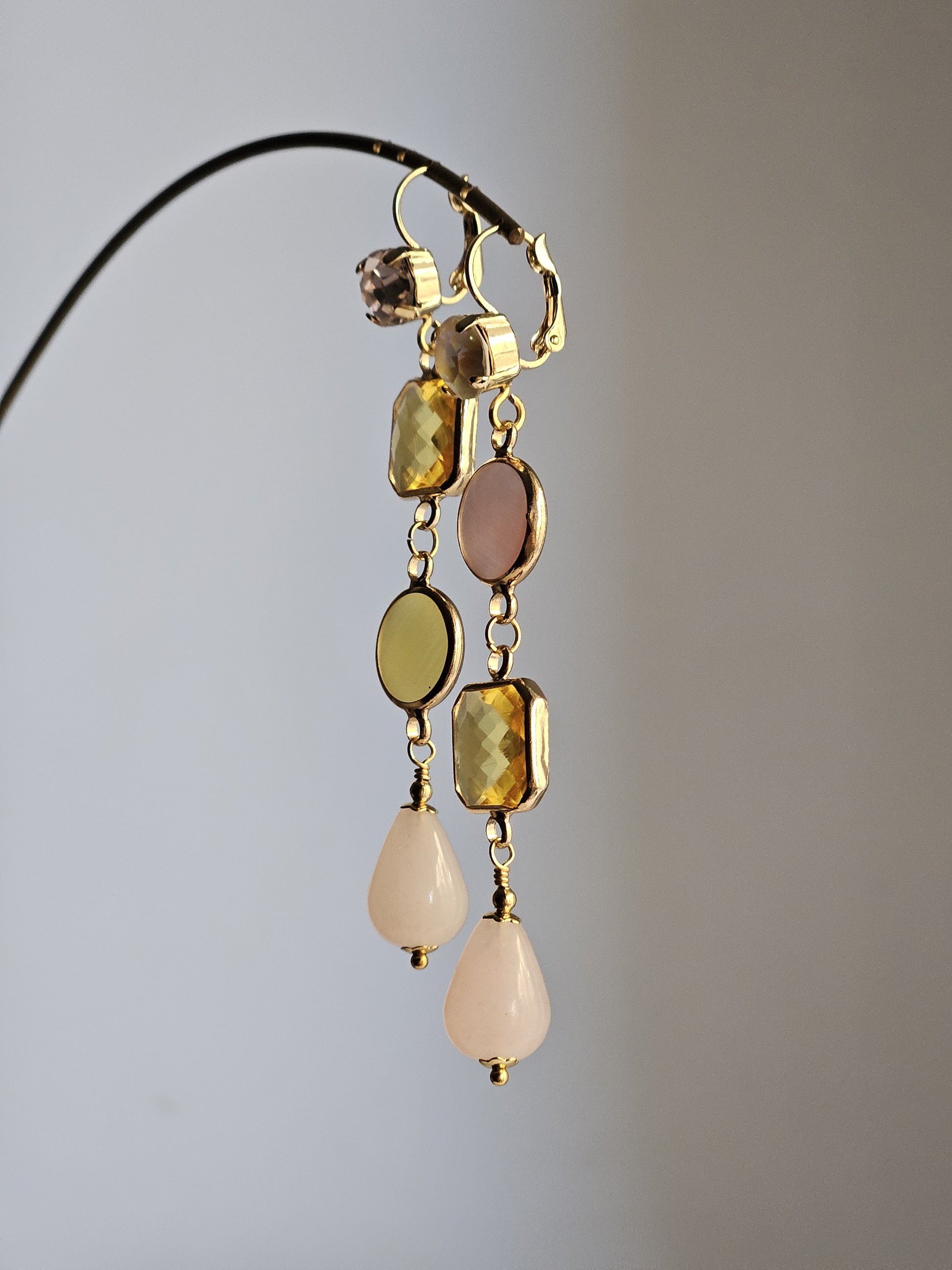 Eleganti orecchini con chiusura con monachella a scatto impreziositi da strass tondi nei toni del vaniglia e del rosa peonia. L’insieme è arricchito da strass rettangolari e tondi che sfumano negli stessi colori mentre due pendenti a goccia in agata di color rosa completano il design.